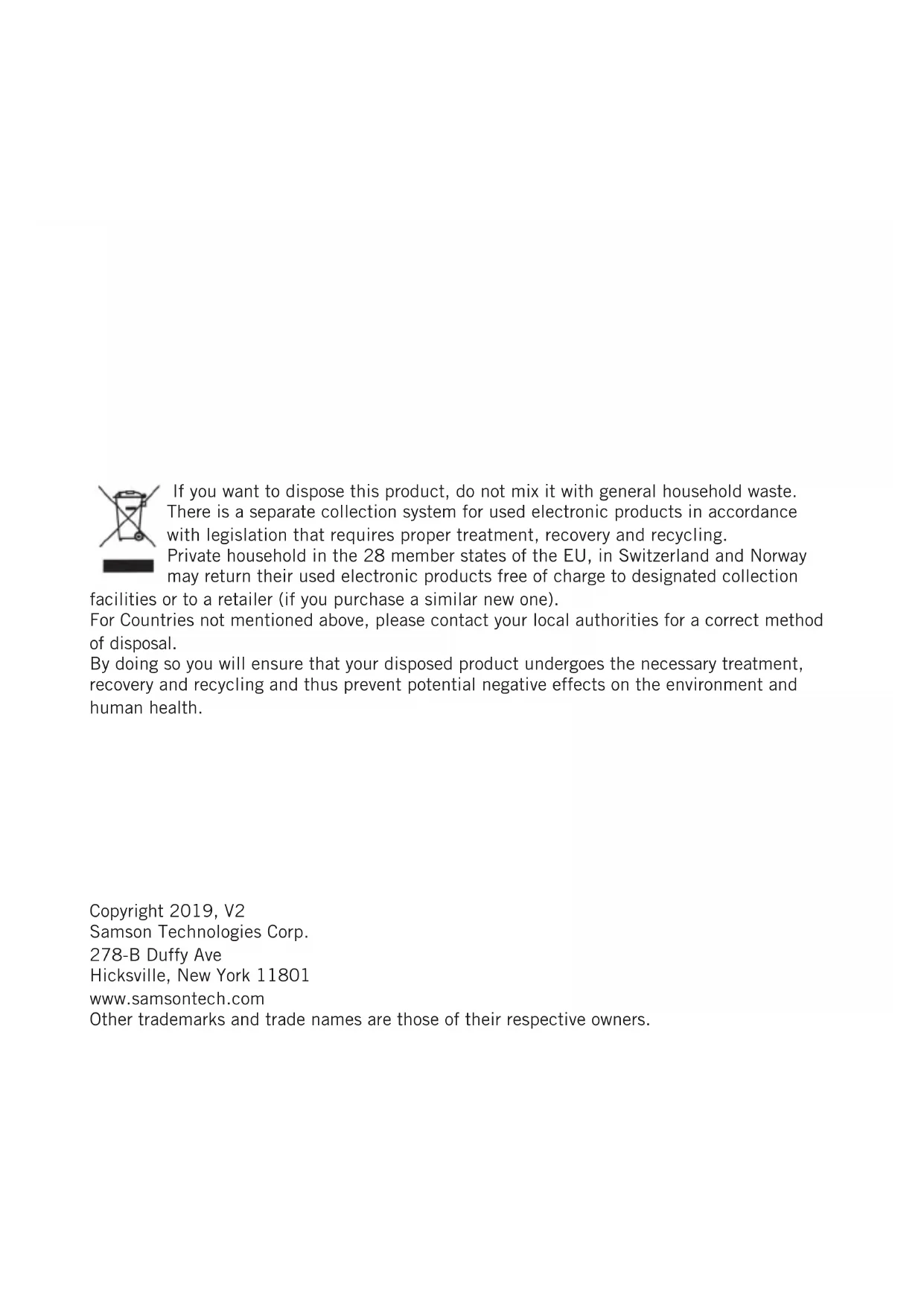 Copyright 2019, V2 Samson Technologies Corp. 278-B Duffy Ave Hicksville, New York 11801 www.samsontech.com Other trademarks and trade names are those of their respective owners. If you want to dispose this product, do not mix it with general household waste. There is a separate collection system for used electronic products in accordance with legislation that requires proper treatment, recovery and recycling. Private household in the 28 member states of the EU, in Switzerland and Norway may return their used electronic products free of charge to designated collection facilities or to a retailer (if you purchase a similar new one). For Countries not mentioned above, please contact your local authorities for a correct method of disposal. By doing so you will ensure that your disposed product undergoes the necessary treatment, recovery and recycling and thus prevent potential negative effects on the environment and human health.ENGLISHFRANÇAISDEUTSCHEESPAÑOLITALIANO WARNING! This product is capable of causing permanent damage to your hearing if used at excessive volumes! To protect your hearing, the Samson SR550 headphones should always be used at as low a volume as possible. We recommend that you stringently follow the guidelines established by the U.S. Occupational Safety Health Administration (OSHA) regarding maximum time exposure at various sound pressure levels: