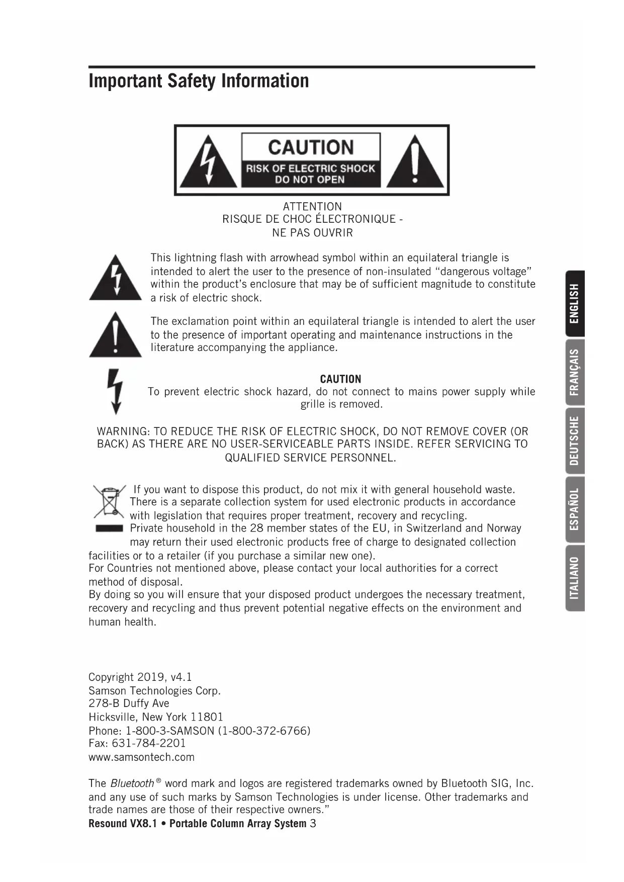 - Consult the dealer or an experienced radio/TV technician for help. FCC Radiation Exposure Statement This equipment complies with FCC RF radiation exposure limits set forth for an uncontrolled environment. RF Warning Statement This equipment complies with FCC‘s RF radiation exposure limits set forth for an uncontrolled environment. End user must follow the specific operating instructions for satisfying RF exposure compliance. This transmitter must not be co-located or operating in conjunction with any other antenna or transmitter. Hereby, Samson Technologies Corp., declares that this Resound VX8.1 is in compliance with the essential requirements and other relevant provisions of Directive 2014/53/EU. The declaration of conformity may be consulted at: http://www.samsontech.com/site_media/support/manuals/VX8.1_DOC.pdf6 Congratulations on purchasing the Resound VX8.1 Portable Column Array System from Samson! The Resound VX8.1 is an all-in-one system featuring a12” subwoofer and eight 3.5” drivers arranged in a vertical speaker array. Installation and setup are extremely easy with the three column array pieces locking together and fitting into the subwoofer. The onboard 3-channel mixer allows the Resound VX8.1 to be used a stand alone PA, or it can be connected to a mixer an used as part of a sound reinforcement system. The vertical array can be arranged in-line for 120° of horizontal coverage, or rotated 45° left and right for an ultra-wide 200° of coverage. The mixer has inputs for microphones, instruments and line level devices. The Resound VX8.1 also includes wireless Bluetooth