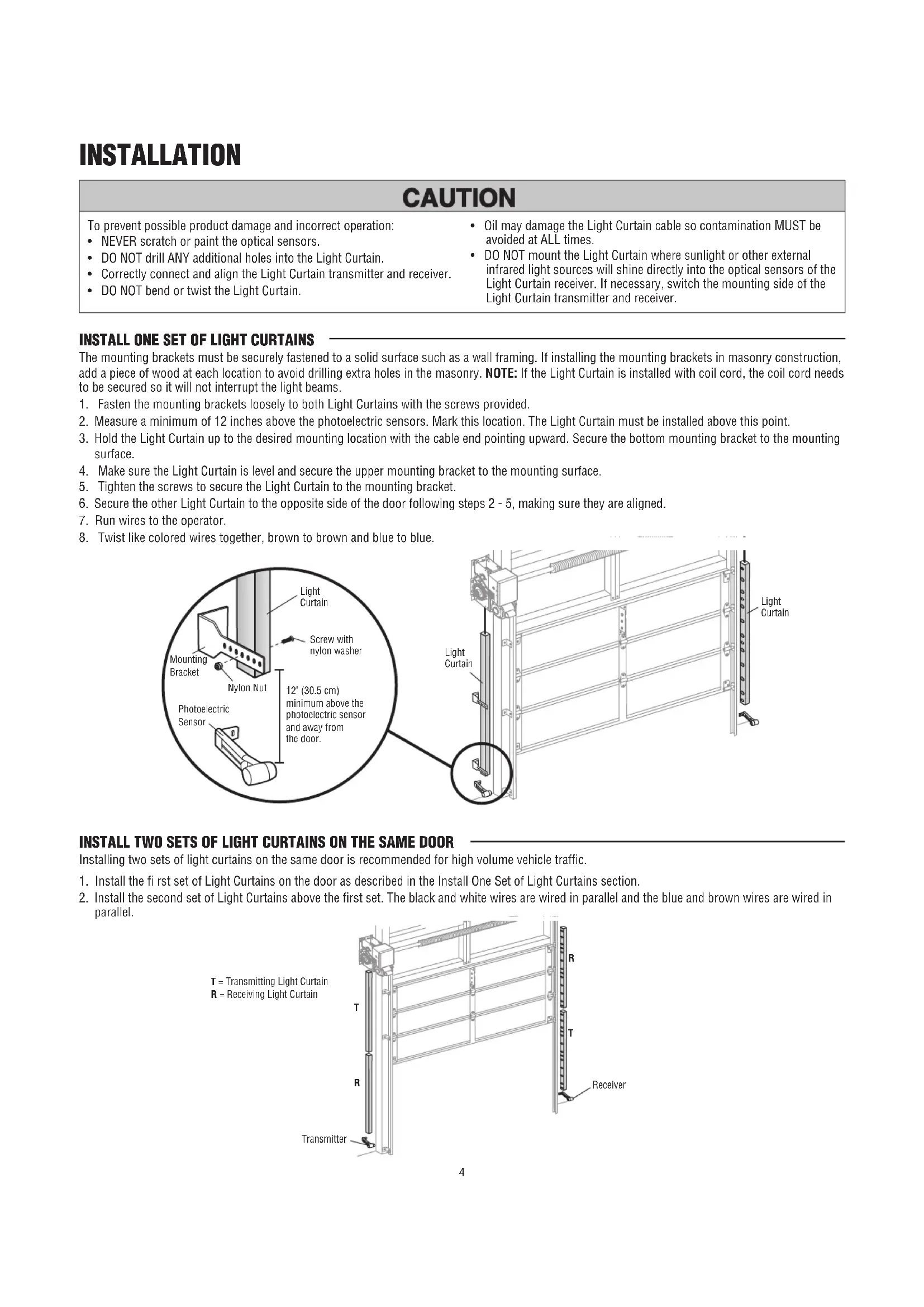 - DO NOT mount the Light Curtain where sunlight or other external infrared light sources will shine directly into the optical sensors of the Light Curtain receiver. If necessary, switch the mounting side of the Light Curtain transmitter and receiver. INSTALLATION INSTALL TWO SETS OF LIGHT CURTAINS ON THE SAME DOOR Installing two sets of light curtains on the same door is recommended for high volume vehicle traffi c.