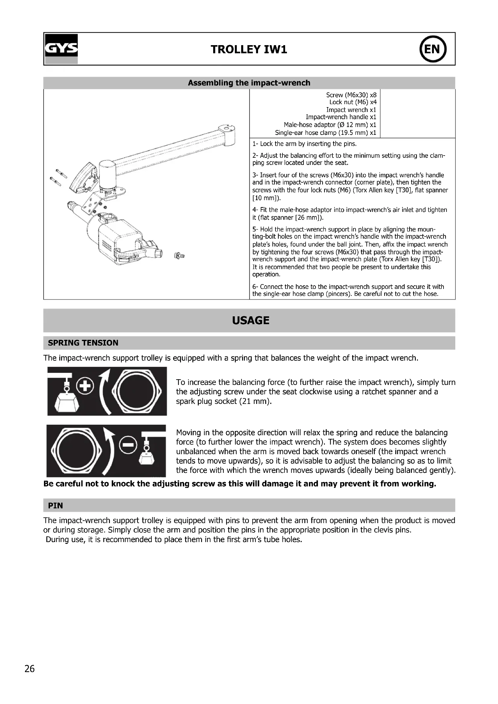 the single-ear hose clamp (pincers). Be careful not to cut the hose. USAGE SPRING TENSION The impact-wrench support trolley is equipped with a spring that balances the weight of the impact wrench. To increase the balancing force (to further raise the impact wrench), simply turn the adjusting screw under the seat clockwise using a ratchet spanner and a spark plug socket (21 mm). Moving in the opposite direction will relax the spring and reduce the balancing force (to further lower the impact wrench). The system does becomes slightly unbalanced when the arm is moved back towards oneself (the impact wrench tends to move upwards), so it is advisable to adjust the balancing so as to limit the force with which the wrench moves upwards (ideally being balanced gently). Be careful not to knock the adjusting screw as this will damage it and may prevent it from working. PIN The impact-wrench support trolley is equipped with pins to prevent the arm from opening when the product is moved or during storage. Simply close the arm and position the pins in the appropriate position in the clevis pins. During use, it is recommended to place them in the rst arm’s tube holes.27 TROLLEY IW1