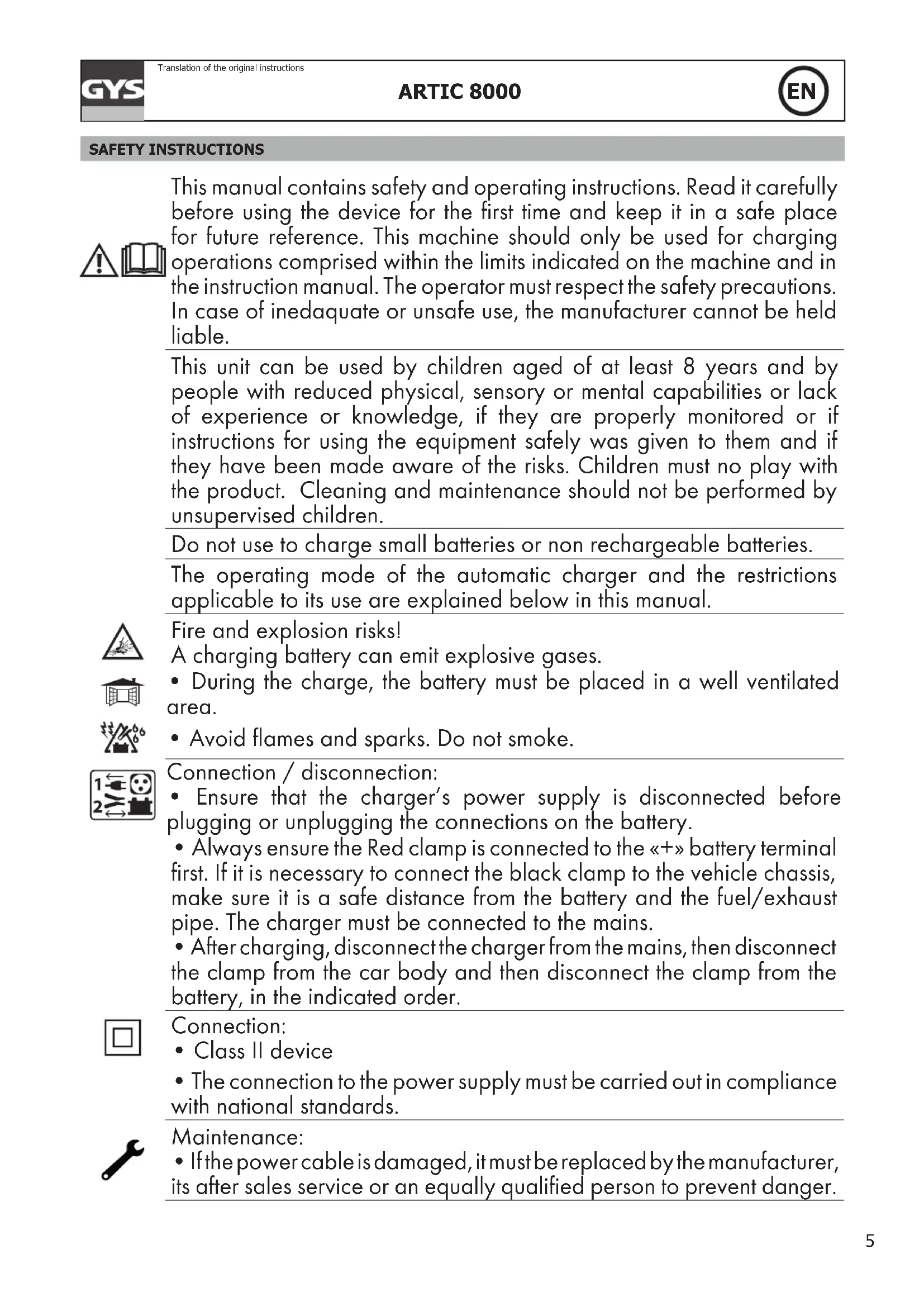 Download the instructions for your Battery charger in PDF format for free! Find your manual Artic 8000 - GYS and take your electronic device back in hand. On this page are published all the documents necessary for the use of your device. Artic 8000 by GYS.
