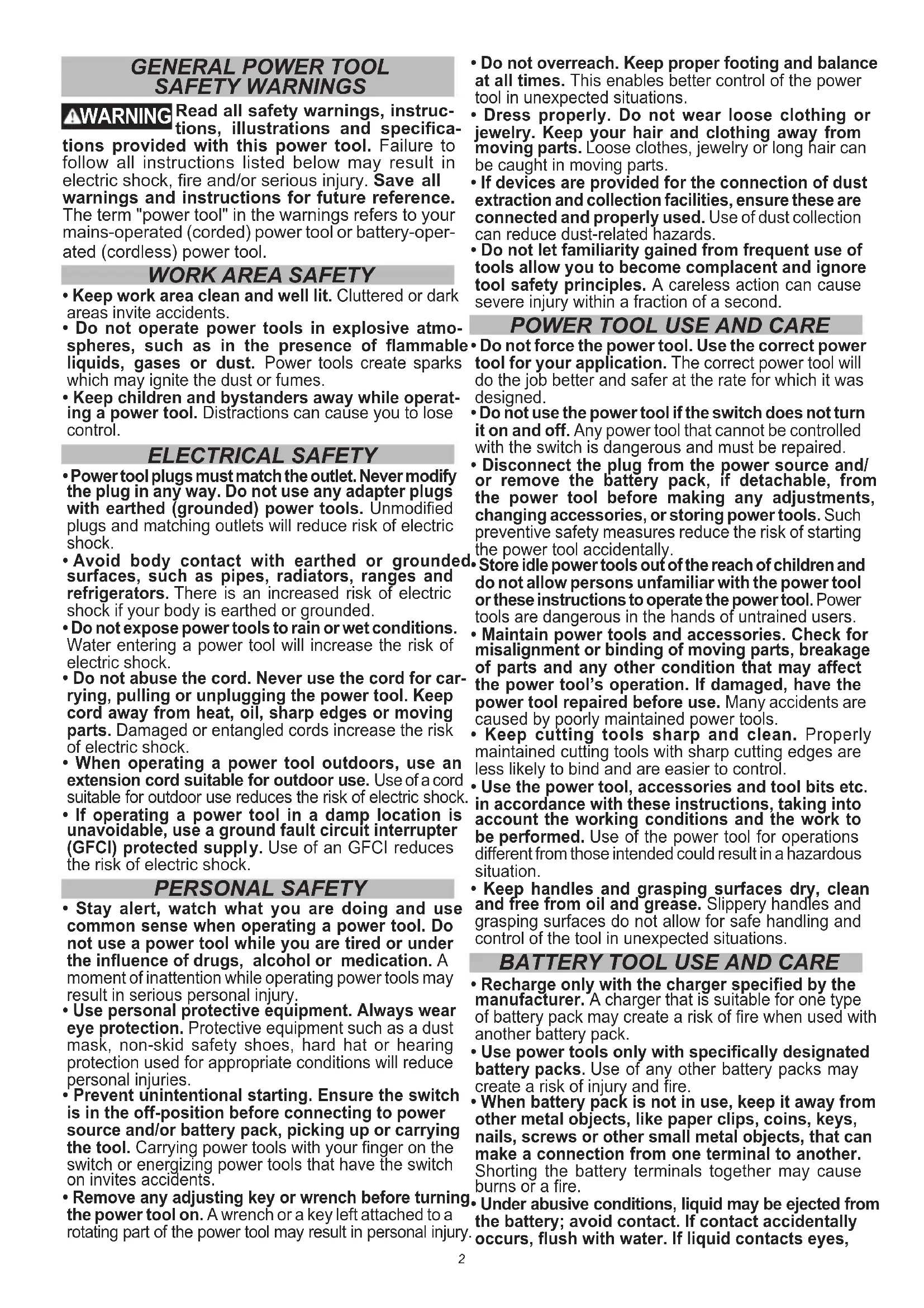 - If operating a power tool in a damp location is unavoidable, use a ground fault circuit interrupter (GFCI) protected suppl y. Use of an GFCI reduces the risk of electric shock. PERSONAL SAFETY
