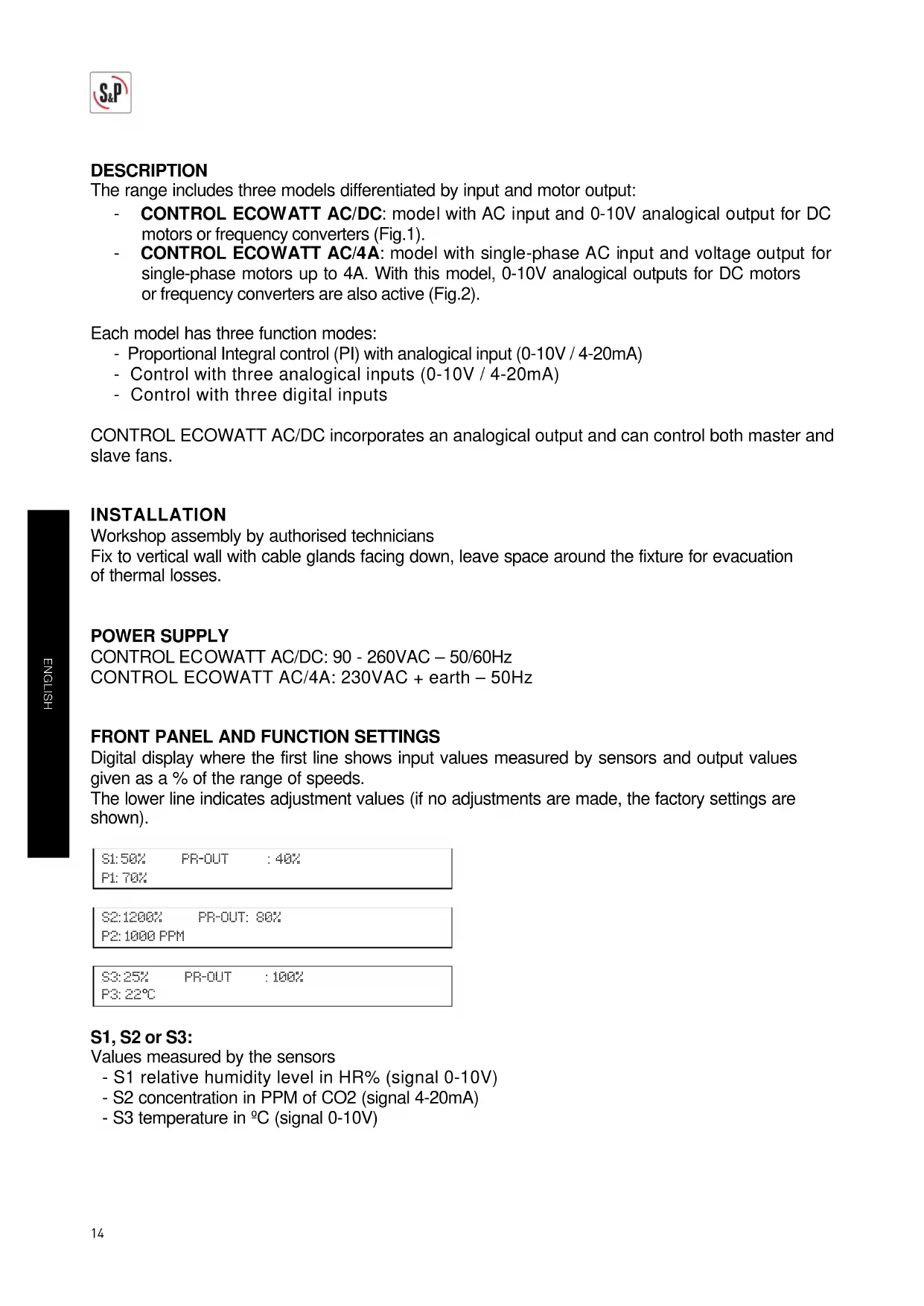 Digital display where the first line shows input values measured by sensors and output values given as a % of the range of speeds. The lower line indicates adjustment values (if no adjustments are made, the factory settings are shown). S1: 50% PR-OUT : 40% P1: 70% S2: 1200% PR-OUT: 80% P2: 1000 PPM S3: 25% PR-OUT : 100% P3: 22°C S1, S2 or S3: Values measured by the sensors - S1 relative humidity level in HR% (signal 0-10V) - S2 concentration in PPM of CO2 (signal 4-20mA) - S3 temperature in ºC (signal 0-10V)15 ENGLISH PR-OUT: - % of 0-10V output for CONTROL ECOWATT AC/DC - % of range of voltage adjustment for AC/4A CONTROL ECOWATT P1, P2 or P3: Settings at the average point of the selected range of functioning adjusted to the premises where the sensor is installed.. Four adjustment keys: - S and T keys for changing the menus - - and + keys for changing the settings LED indicating input signal for sensors S1, S2 and S3 LED indicating output signal or output voltage level (according to model) Green LED “POWER ON” that indicates that the CONTROL ECOWATT is switched on. Red LED “ERROR” that indicates a CONTROL ECOWATT function error.