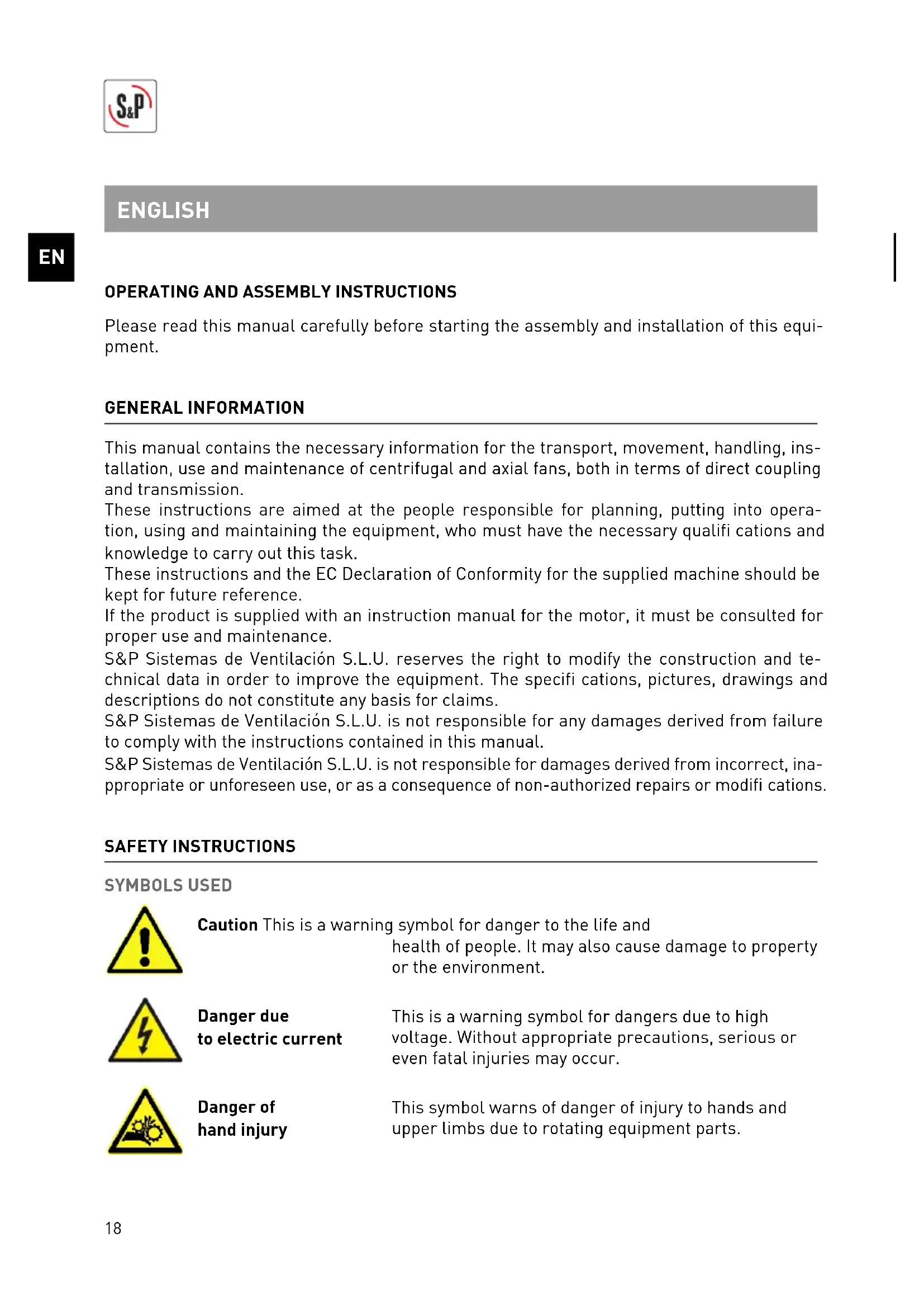 Please read this manual carefully before starting the assembly and installation of this equi- pment. GENERAL INFORMATION This manual contains the necessary information for the transport, movement, handling, ins- tallation, use and maintenance of centrifugal and axial fans, both in terms of direct coupling and transmission. These instructions are aimed at the people responsible for planning, putting into opera- tion, using and maintaining the equipment, who must have the necessary qualifi cations and knowledge to carry out this task. These instructions and the EC Declaration of Conformity for the supplied machine should be kept for future reference. If the product is supplied with an instruction manual for the motor, it must be consulted for proper use and maintenance. S&P Sistemas de Ventilación S.L.U. reserves the right to modify the construction and te- chnical data in order to improve the equipment. The specifi cations, pictures, drawings and descriptions do not constitute any basis for claims. S&P Sistemas de Ventilación S.L.U. is not responsible for any damages derived from failure to comply with the instructions contained in this manual. S&P Sistemas de Ventilación S.L.U. is not responsible for damages derived from incorrect, ina- ppropriate or unforeseen use, or as a consequence of non-authorized repairs or modifi cations. SAFETY INSTRUCTIONS SYMBOLS USED Caution This is a warning symbol for danger to the life and health of people. It may also cause damage to property or the environment. Danger due to electric current This is a warning symbol for dangers due to high voltage. Without appropriate precautions, serious or even fatal injuries may occur. Danger of hand injury This symbol warns of danger of injury to hands and upper limbs due to rotating equipment parts. ENGLISH19