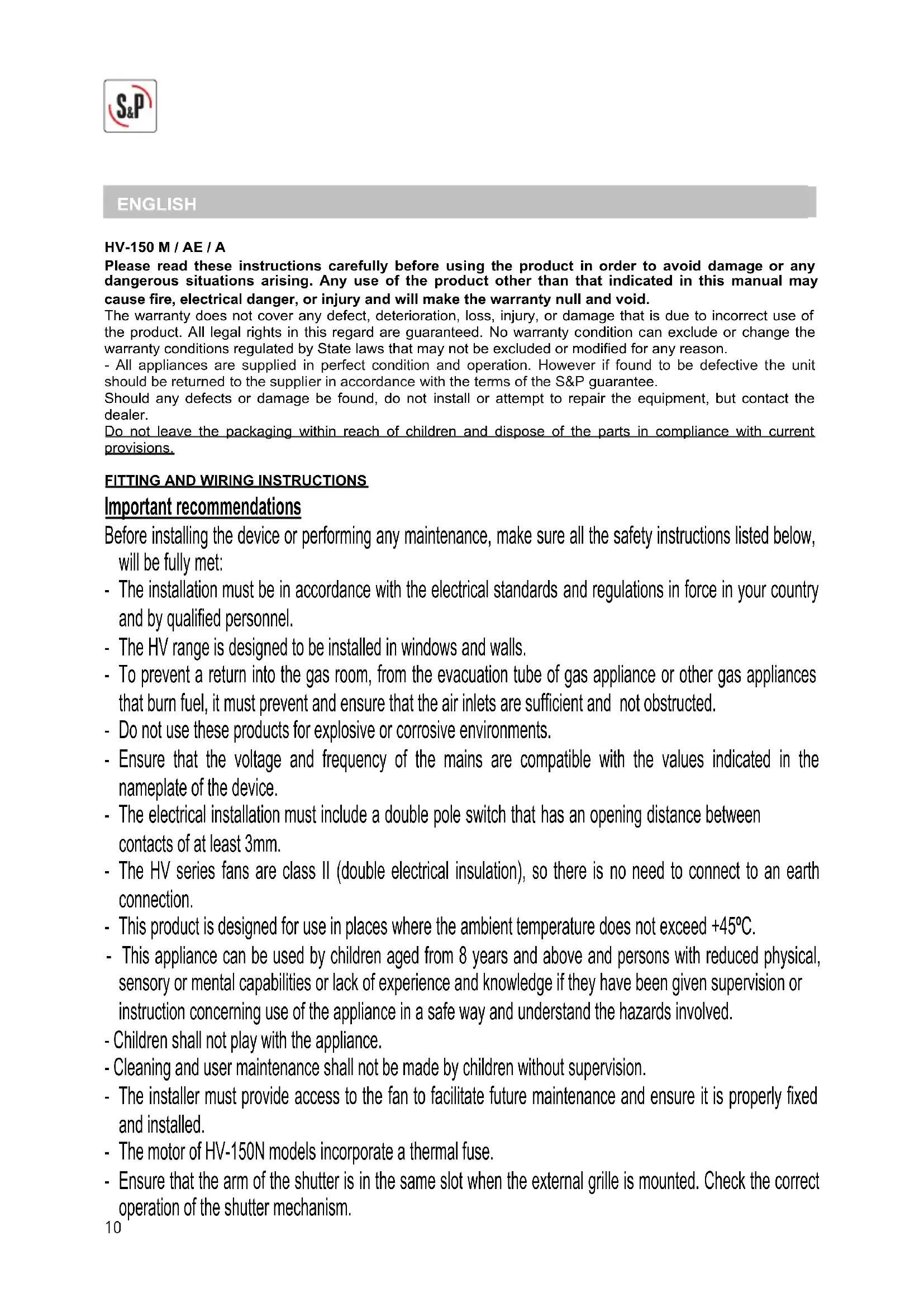 - &KLOGUHQVKDOOQRWSOD\ZLWKWKHDSSOLDQFH - &OHDQLQJDQGXVHUPDLQWHQDQFHVKDOOQRWEHPDGHE\FKLOGUHQZLWKRXWVXSHUYLVLRQ - The installer must provide access to the fan to facilitate future maintenance and ensure it is properly fixed and installed. - The motor of HV-150N models incorporate a thermal fuse. - Ensure that the arm of the shutter is in the same slot when the external grille is mounted. Check the correct operation of the shutter mechanism.11 Fig. 5.- From the outside, place the external grille (e) over the hole in the glass. From the inside, turn and push the rubber mountings (g) until they are located against the glass keeping the external grille (e) in its correct position. Fig. 6.- Mount the support plate (f) to the screws (h) of the external grille (e) and tighten the bolts (d) to suit the thickness of the glass: - Glass thickness 3 - 14 mm: Fig. 6a - Panel thickness 14 - 25 mm: Fig. 6b - Tighten the screws taking care not to flatten the rubber joints between the support plate and the external grille. Ensure that the glass is not in contact with the plastic frame. Fig.7.- Make the necessary hole in the gland (i), and feed the electrical cables through the clamp (j) and connect them in the terminal box (k). Fig. 8.- Mount the internal cover (a) by slotting the rectangular openings (1) on the top of the cover (a) into the receivers (m) of the support plate (f) until the two knobs (c) are correctly positioned. Fig. 9.- Tighten the locking screw (b) Wall mounting (wall thickness between 25 – 300mm) (Ensure that threaded couplers and extended fixing rod (h) are supplied as accessories) - Cut a hole in the wall where the unit is to be mounted, in accordance with the dimensions indicated in figure B. It is recommended that this should be a minimum of 1,5 meters from ground level. - Measure the thickness of the wall and cut the threaded rods (n) 5 mm shorter than this thickness. - Use the appliance to mark on the wall the position of the fixing holes for the support plate (f), drill the fixing holes and insert the wall plugs. - Dismantle the HV-fan in accordance with the following instructions: Fig.10.- Loosen the retaining screw (b) fixing the internal front cover (a). Fig.11.- Remove the internal front cover (a) by pressing the knobs (c). Fig.12.- Loosen the 3 bolts (d) fixing the internal grille (e) and separate it from the support plate (f). - lnstall the HV-fan in the wall as follows: Fig.13.- Pull the internal grille (e) towards you and take the rubber mountings (g) away from the screws (h). Fig.14.- Fix the threaded rods (n) to the screws (h) on the external grille (e) with the threaded couplers (p) supplied and put back the rubber mountings (g) on the rods. Fig.15.- From the outside, place the external grille (e) over the hole in the wall. From the inside, turn and push the rubber mountings (g) until they are located against the wall keeping the external grille (e) in its correct position. Fig.16.- Mount the support plate (f) to the threaded rods (n) and tighten the bolts (d) to suit the length of the rod sticking out from the support plate (f). Fig.17.- Fix the support plate (f) to the wall and tighten bolts (d). Fig.18.- Depending on the position of the incoming electrical cables, make a hole on the gland (i) on the front cover (a) or in the gland (p) on the support plate (f), introduce the electrical cables through the clamp (j) and connect to the terminal box (k). Fig.19.- Mount the internal cover (a) by slotting the rectangular openings (1) on the top of the cover (a) into the receivers (m) of the support plate (f) until the two knobs (c) are correctly positioned. Fig. 9.- Tighten the locking screw (b). - It is recommended that you check the condition and operation of the appliance after unpacking it; any factory defect is covered by the S&P guarantee. Mounting on Glass windows (Glass thickness between 325mm) You can identify all the components of the device in figure A, and the measures required for the correct installation of the device in figure B. Cut a hole following the dimensions indicated on figure B. It is recommended that this should be a minimum of 1,5 meters from ground level. - Dismantle the HV-fan in accordance with the following instructions: Fig. 1.- Loosen the retaining screw (b) fixing the internal front cover (a). Fig. 2.- Remove the internal front cover (a) by pressing the knobs (c). Fig. 3.- Unscrew the 3 bolts (d) fixing the external grille (e) and separate from the support plate (f). - Install the HV on the glass as indicated below: Fig. 4.- Pull the external grille (e) towards you and turn the rubber mounting (g) on the screws (h), towards the inner side of the grille.12 Operation mode x HV-150 M Model (Manually operated via pull cord) 3 operation modes via pull cord Mode 1 Fan Off – Shutter closed Mode 2 Fan Off – Shutter open (natural ventilation). Mode 3 Fan On- Working as air extract (Mechanical ventilation) x HV-150 AE Model 2 operation modes: Mode 1 Fan Off – Shutter closed Mode 2 Fan On – Working as air extract x HV-150 A Model (To operate all these functions use the accessory CR-150 of S&P) 3 operation modes: Mode 1 Fan Off – Shutter closed Mode 2 Fan Off – Shutter open (Natural ventilation). Mode 3 Fan On – Working as air extract (Mechanical ventilation). OFF: Shutter closed / air extract closed ON + : Shutter open / air extract closed (natural ventilation) ON + : Shutter open / working as air extract (mechanical ventilation) ATTENTION: The CR-150 control of S&P is delivered with a joint between contacts 5-1. This joint has to be moved, so that the joint is positioned between contacts 5-2. NOTE: One CR-150 of S&P can control up to 5 HV-150A. Maintenance - Before handling the fan, make sure it is disconnected from the mains supply - Clean regularly with a soft cloth moistened with water. - Periodically check the state of the impeller - Do not clean with pressure water jet. Removal from service, disposal and recycling The CEE norm an