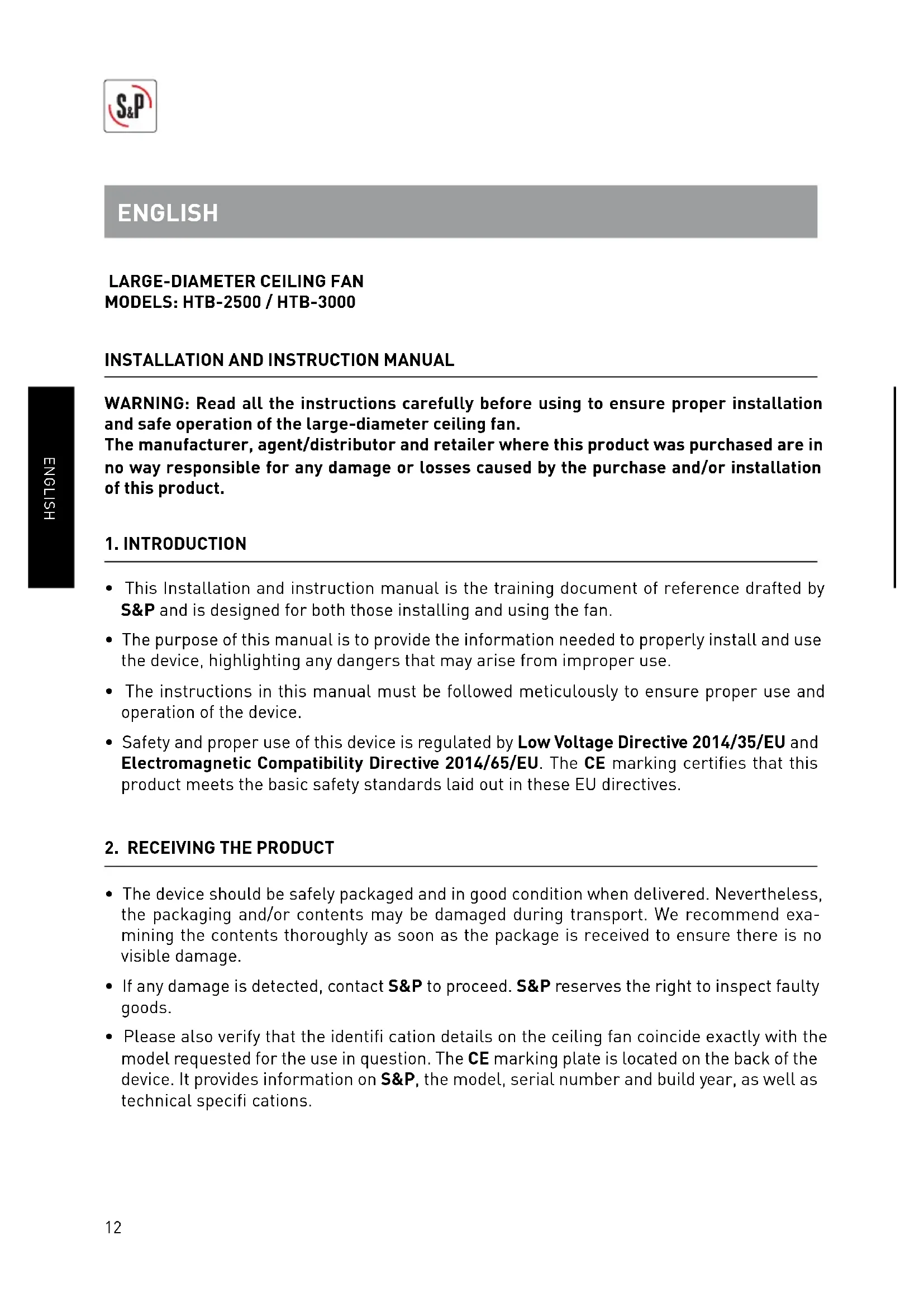- This Installation and instruction manual is the training document of reference drafted by S&P and is designed for both those installing and using the fan.