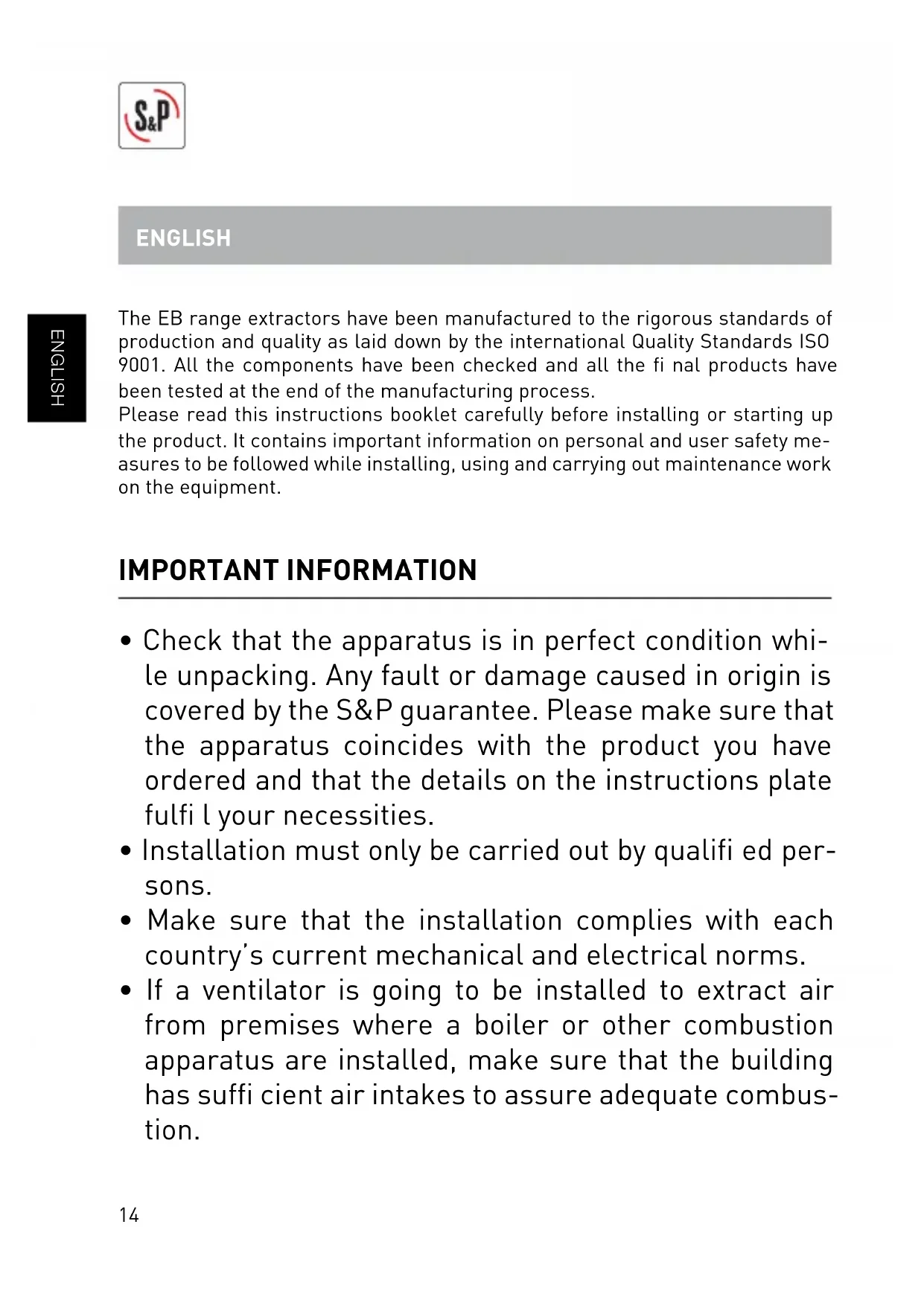 - Check that the apparatus is in perfect condition whi- le unpacking. Any fault or damage caused in origin is covered by the S&P guarantee. Please make sure that the apparatus coincides with the product you have ordered and that the details on the instructions plate fulfi l your necessities.