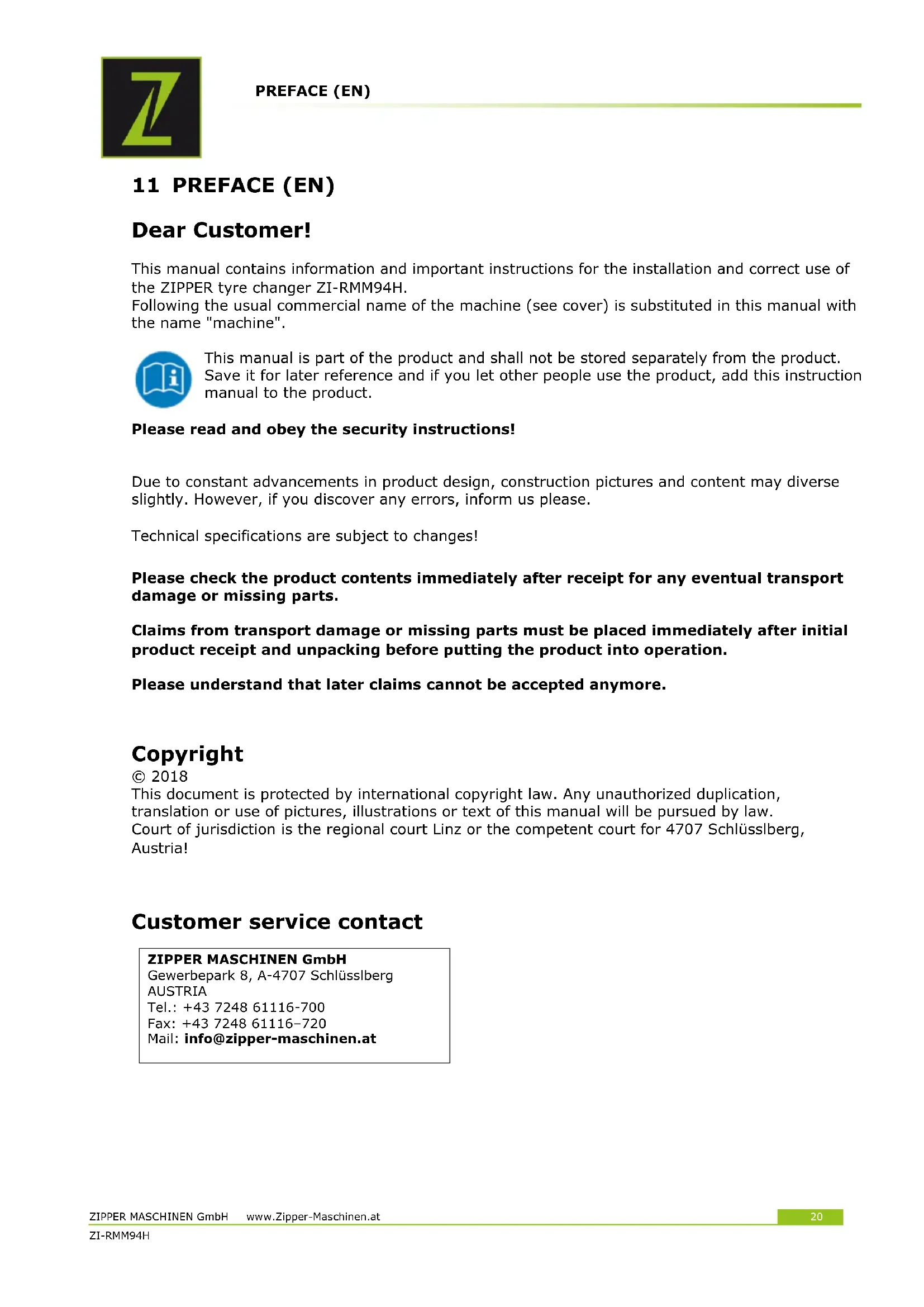 ZIPPER MASCHINEN GmbH Gewerbepark 8, A-4707 Schlüsslberg AUSTRIA Tel.: +43 7248 61116-700 Fax: +43 7248 61116–720 Mail: info@zipper-maschinen.atSAFETY ZIPPER MASCHINEN GmbH www.Zipper-Maschinen.at 21 ZI-RMM94H21 12 SAFETY This section contains information and important notices for safe commissioning and handling of machine. For your own safety, read these operating instructions carefully before putting the machine into operation. This will enable you to handle the machine safely and prevent misunderstandings as well as possible damage to property and persons. Also observe the symbols and pictograms used as well as the safety instructions and hazard warnings! Intended use of the machine The machine is intended exclusively for the following activities: With the ZIPPER tyre changer ZI-RMM94H tires can be mounted, dismantled and inflated on rims. ZIPPER-MASCHINEN assumes no responsibility or warranty for any other use or use beyond this and for any resulting damage to property or injury.