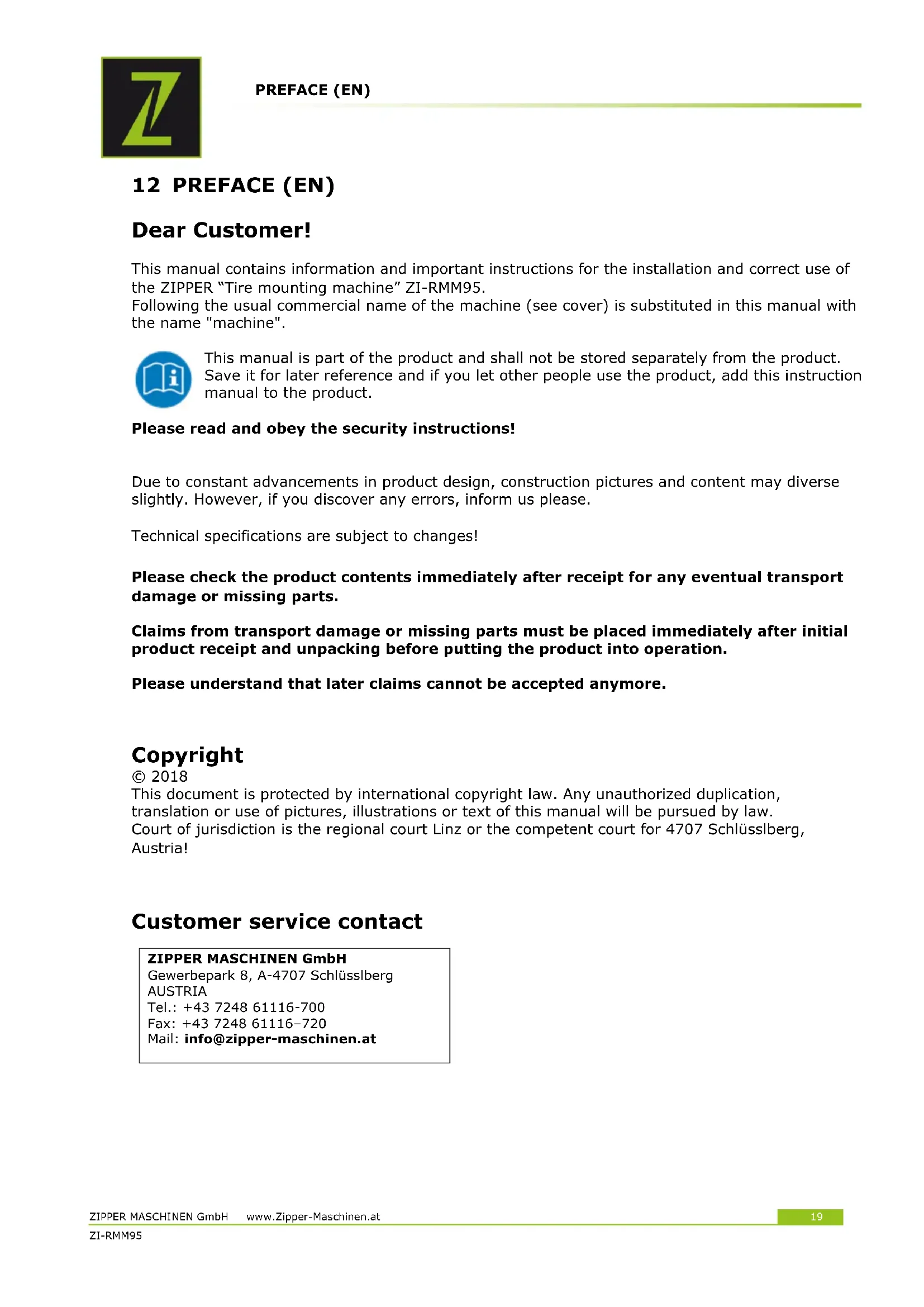 ZIPPER MASCHINEN GmbH Gewerbepark 8, A-4707 Schlüsslberg AUSTRIA Tel.: +43 7248 61116-700 Fax: +43 7248 61116–720 Mail: info@zipper-maschinen.atSAFETY ZIPPER MASCHINEN GmbH www.Zipper-Maschinen.at 20 ZI-RMM95 13 SAFETY This section contains information and important notices for safe commissioning and handling of machine. For your own safety, read these operating instructions carefully before putting the machine into operation. This will enable you to handle the machine safely and prevent misunderstandings as well as possible damage to property and persons. Also observe the symbols and pictograms used as well as the safety instructions and hazard warnings! Intended use of the machine The machine is intended exclusively for the following activities: Mounting and dismounting tyres on rims and inflating these tyres. ZIPPER-MASCHINEN assumes no responsibility or warranty for any other use or use beyond this and for any resulting damage to property or injury.