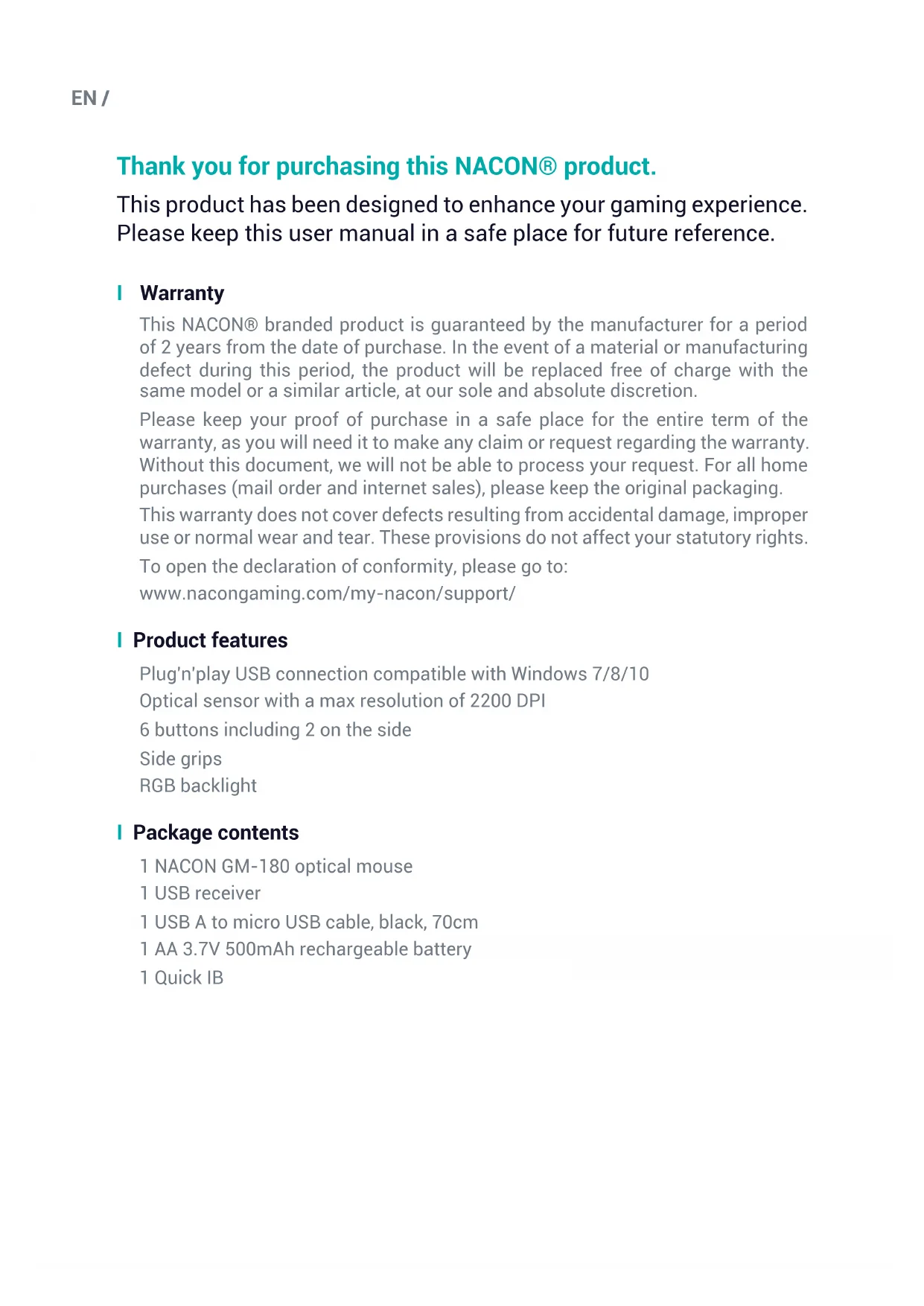 Thank you for purchasing this NACON® product. This product has been designed to enhance your gaming experience. Please keep this user manual in a safe place for future reference. I Warranty This NACON® branded product is guaranteed by the manufacturer for a period of 2 years from the date of purchase. In the event of a material or manufacturing defect during this period, the product will be replaced free of charge with the same model or a similar article, at our sole and absolute discretion. Please keep your proof of purchase in a safe place for the entire term of the warranty, as you will need it to make any claim or request regarding the warranty. Without this document, we will not be able to process your request. For all home purchases (mail order and internet sales), please keep the original packaging. This warranty does not cover defects resulting from accidental damage, improper use or normal wear and tear. These provisions do not affect your statutory rights. To open the declaration of conformity, please go to: www.nacongaming.com/my-nacon/support/ I Product features Plug'n'play USB connection compatible with Windows 7/8/10 Optical sensor with a max resolution of 2200 DPI 6 buttons including 2 on the side Side grips RGB backlight I Package contents 1 NACON GM-180 optical mouse 1 USB receiver 1 USB A to micro USB cable, black, 70cm 1 AA 3.7V 500mAh rechargeable battery 1 Quick IBEN / I Control elements