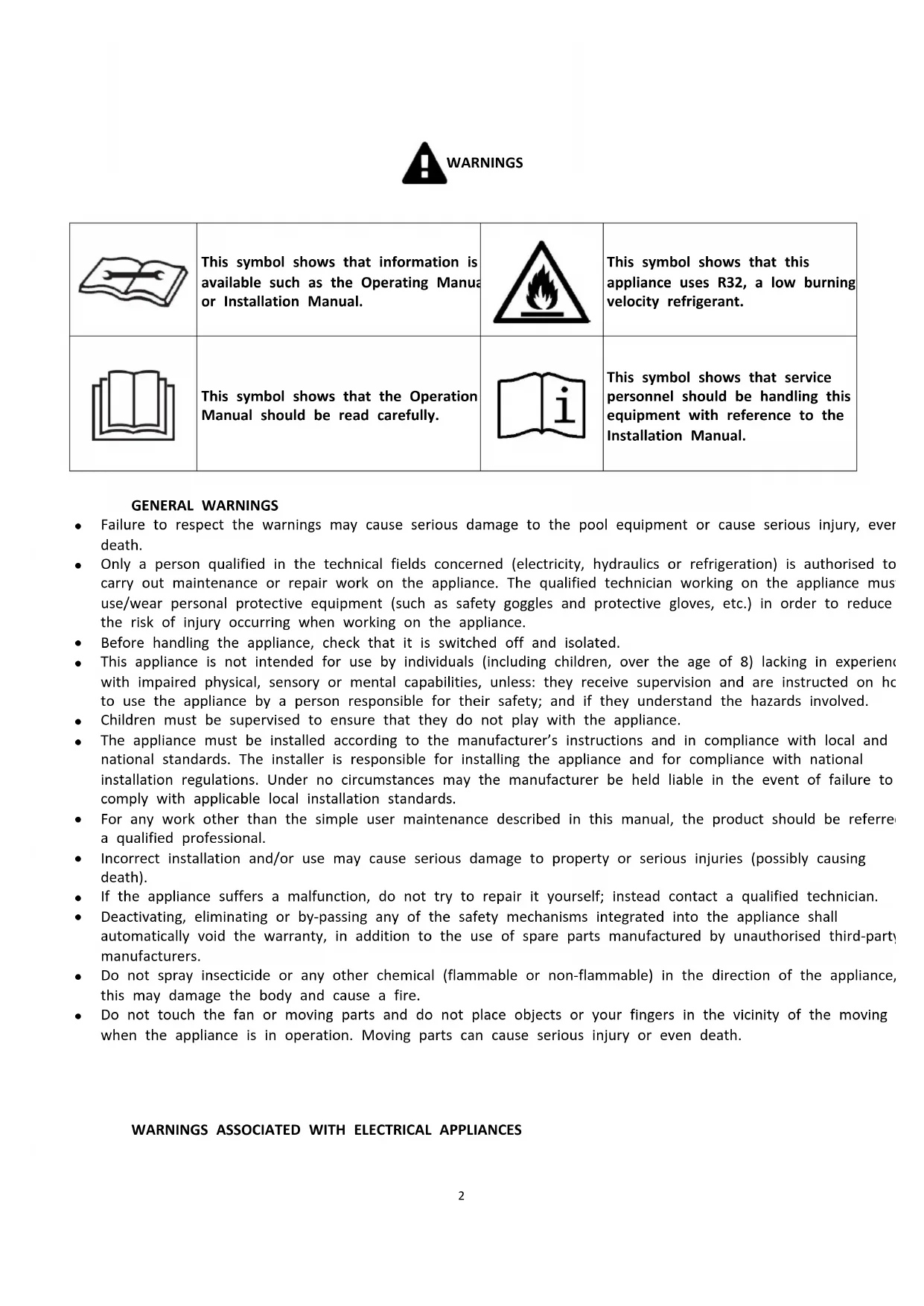 Failure to respect the warnings may cause serious damage to the pool equipment or cause serious injury, even death.