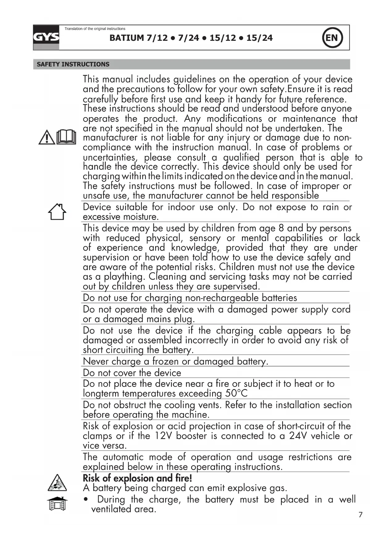 - During the charge, the battery must be placed in a well ventilated area.BATIUM 7/12 • 7/24 • 15/12 • 15/24
