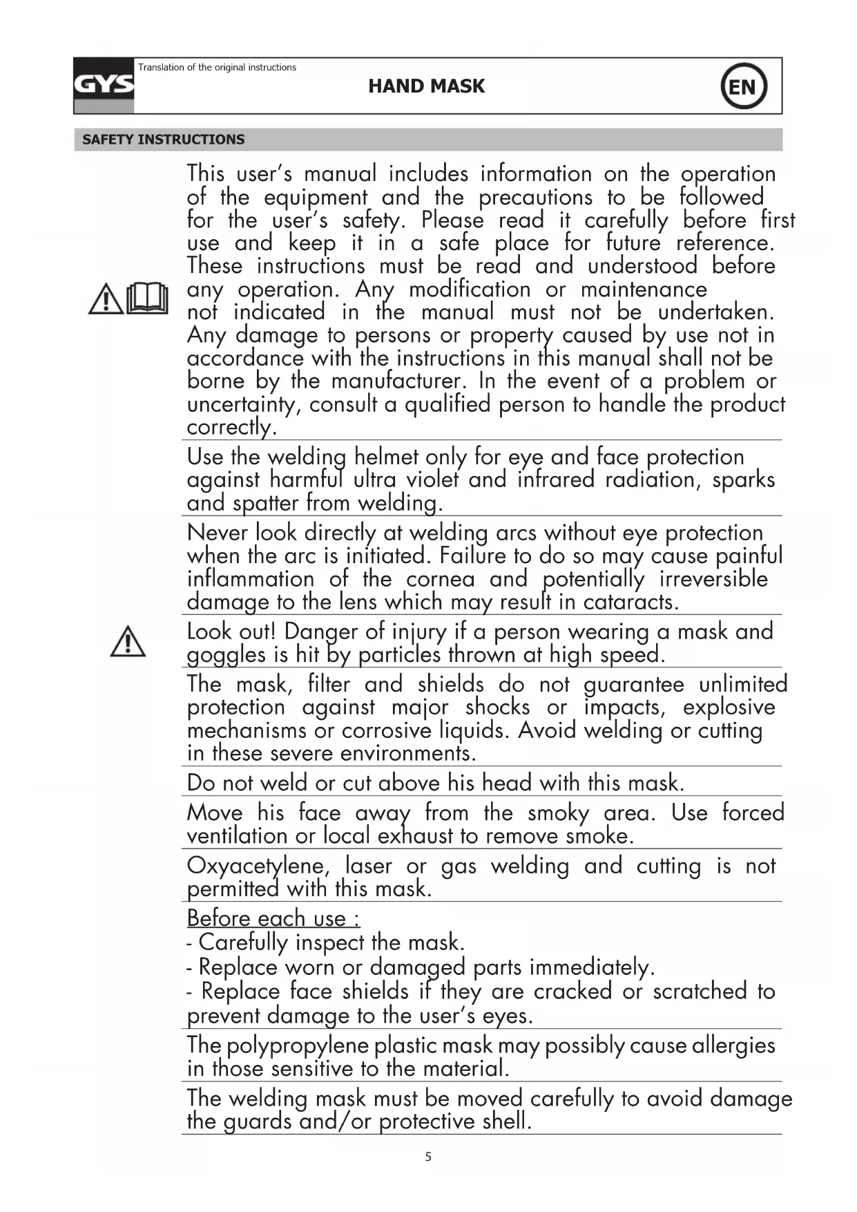 Translation of the original instructions SAFETY INSTRUCTIONS This user’s manual includes information on the operation of the equipment and the precautions to be followed for the user’s safety. Please read it carefully before rst use and keep it in a safe place for future reference. These instructions must be read and understood before any operation. Any modication or maintenance not indicated in the manual must not be undertaken. Any damage to persons or property caused by use not in accordance with the instructions in this manual shall not be borne by the manufacturer. In the event of a problem or uncertainty, consult a qualied person to handle the product correctly. Use the welding helmet only for eye and face protection against harmful ultra violet and infrared radiation, sparks and spatter from welding. Never look directly at welding arcs without eye protection when the arc is initiated. Failure to do so may cause painful inammation of the cornea and potentially irreversible damage to the lens which may result in cataracts. Look out! Danger of injury if a person wearing a mask and goggles is hit by particles thrown at high speed. The mask, lter and shields do not guarantee unlimited protection against major shocks or impacts, explosive mechanisms or corrosive liquids. Avoid welding or cutting in these severe environments. Do not weld or cut above his head with this mask. Move his face away from the smoky area. Use forced ventilation or local exhaust to remove smoke. Oxyacetylene, laser or gas welding and cutting is not permitted with this mask. Before each use : - Carefully inspect the mask. - Replace worn or damaged parts immediately. - Replace face shields if they are cracked or scratched to prevent damage to the user’s eyes. The polypropylene plastic mask may possibly cause allergies in those sensitive to the material. The welding mask must be moved carefully to avoid damage the guards and/or protective shell.6 HAND MASK