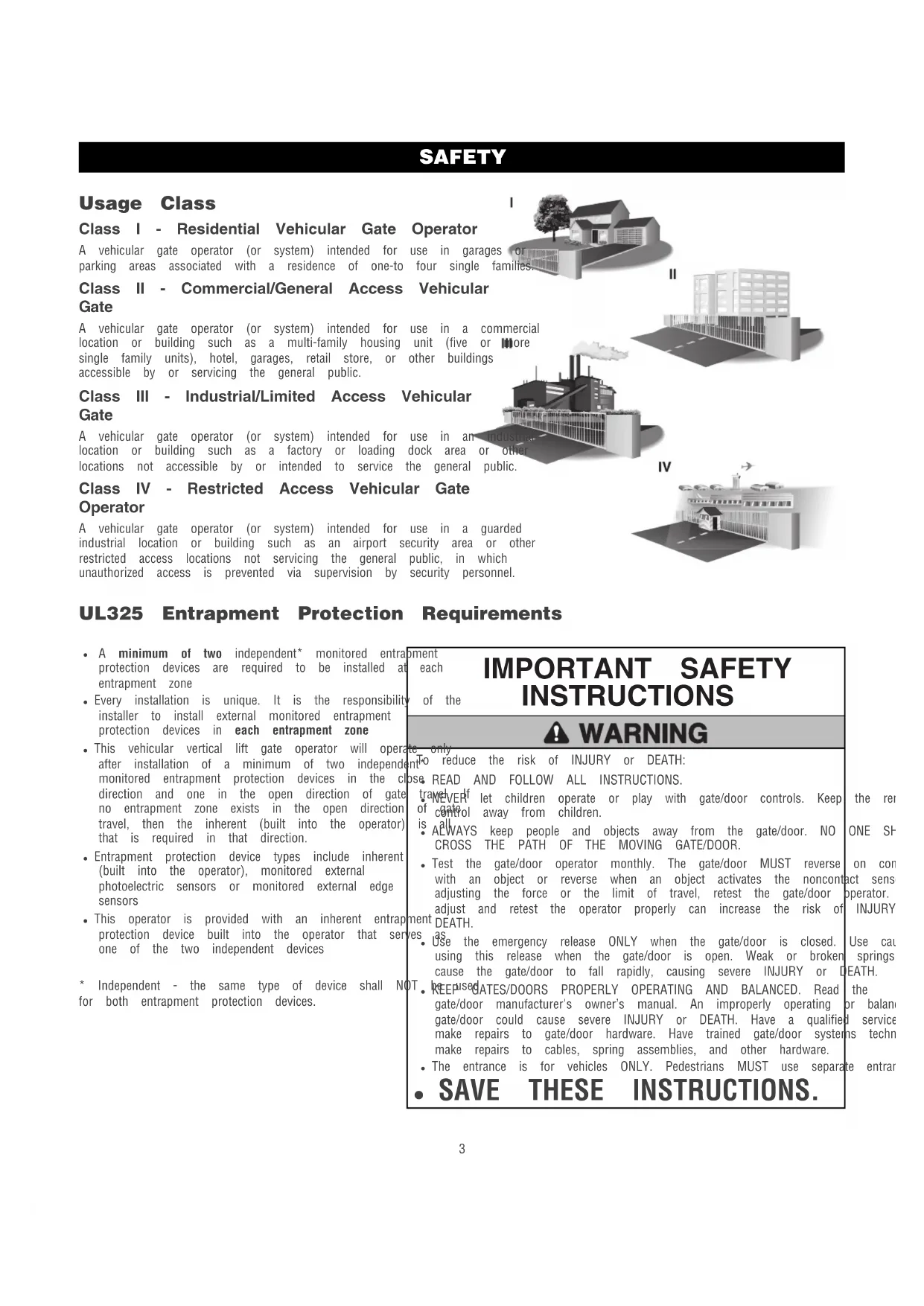 A minimum of two independent* monitored entrapmentprotection devices are required to be installed at eachentrapment zonel Every installation is unique. It is the responsibility of theinstaller to install external monitored entrapmentprotection devices in each entrapment zonel This vehicular vertical lift gate operator will operate onlyafter installation of a minimum of two independent*monitored entrapment protection devices in the closedirection and one in the open direction of gate travel. Ifno entrapment zone exists in the open direction of gatetravel, then the inherent (built into the operator) is allthat is required in that direction.l Entrapment protection device types include inherent(built into the operator), monitored externalphotoelectric sensors or monitored external edgesensorsl This operator is provided with an inherent entrapmentprotection device built into the operator that serves asone of the two independent devices* Independent - the same type of device shall NOT be usedfor both entrapment protection devices. IMPORTANT SAFETY INSTRUCTIONS To reduce the risk of INJURY or DEATH:l READ AND FOLLOW ALL INSTRUCTIONS.l NEVER let children operate or play with gate/door controls. Keep the remotecontrol away from children.l ALWAYS keep people and objects away from the gate/door. NO ONE SHOULDCROSS THE PATH OF THE MOVING GATE/DOOR.l Test the gate/door operator monthly. The gate/door MUST reverse on contactwith an object or reverse when an object activates the noncontact sensors. Afteradjusting the force or the limit of travel, retest the gate/door operator. Failure toadjust and retest the operator properly can increase the risk of INJURY orDEATH.l Use the emergency release ONLY when the gate/door is closed. Use caution whenusing this release when the gate/door is open. Weak or broken springs maycause the gate/door to fall rapidly, causing severe INJURY or DEATH.l KEEP GATES/DOORS PROPERLY OPERATING AND BALANCED. Read thegate/door manufacturer's owner’s manual. An improperly operating or balancedgate/door could cause severe INJURY or DEATH. Have a qualified service personmake repairs to gate/door hardware. Have trained gate/door systems technicianmake repairs to cables, spring assemblies, and other hardware.l The entrance is for vehicles ONLY. Pedestrians MUST use separate entrance. l SAVE THESE INSTRUCTIONS. SAFETY4 Safety Installation Information