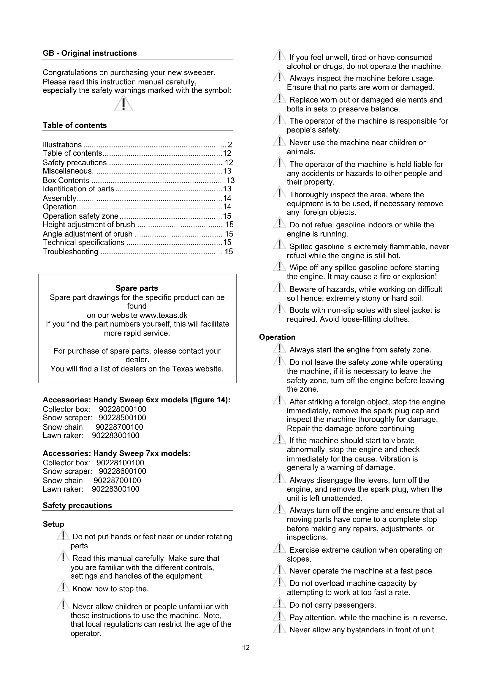 Accessories: Handy Sweep 6xx models (figure 14): Collector box: 90228000100 Snow scraper: 90228500100 Snow chain: 90228700100 Lawn raker: 90228300100 Accessories: Handy Sweep 7xx models: Collector box: 90228100100 Snow scraper: 90228600100 Snow chain: 90228700100 Lawn raker: 90228300100 Safety precautions Setup Do not put hands or feet near or under rotating parts. Read this manual carefully. Make sure that you are familiar with the different controls, settings and handles of the equipment. Know how to stop the. Never allow children or people unfamiliar with these instructions to use the machine. Note, that local regulations can restrict the age of the operator. If you feel unwell, tired or have consumed alcohol or drugs, do not operate the machine. Always inspect the machine before usage. Ensure that no parts are worn or damaged. Replace worn out or damaged elements and bolts in sets to preserve balance. The operator of the machine is responsible for people’s safety. Never use the machine near children or animals. The operator of the machine is held liable for any accidents or hazards to other people and their property. Thoroughly inspect the area, where the equipment is to be used, if necessary remove any foreign objects. Do not refuel gasoline indoors or while the engine is running. Spilled gasoline is extremely flammable, never refuel while the engine is still hot. Wipe off any spilled gasoline before starting the engine. It may cause a fire or explosion! Beware of hazards, while working on difficult soil hence; extremely stony or hard soil. Boots with non-slip soles with steel jacket is required. Avoid loose-fitting clothes. Operation Always start the engine from safety zone. Do not leave the safety zone while operating the machine, if it is necessary to leave the safety zone, turn off the engine before leaving the zone. After striking a foreign object, stop the engine immediately, remove the spark plug cap and inspect the machine thoroughly for damage. Repair the damage before continuing If the machine should start to vibrate abnormally, stop the engine and check immediately for the cause. Vibration is generally a warning of damage. Always disengage the levers, turn off the engine, and remove the spark plug, when the unit is left unattended. Always turn off the engine and ensure that all moving parts have come to a complete stop before making any repairs, adjustments, or inspections. Exercise extreme caution when operating on slopes. Never operate the machine at a fast pace. Do not overload machine capacity by attempting to work at too fast a rate. Do not carry passengers. Pay attention, while the machine is in reverse. Never allow any bystanders in front of unit.13