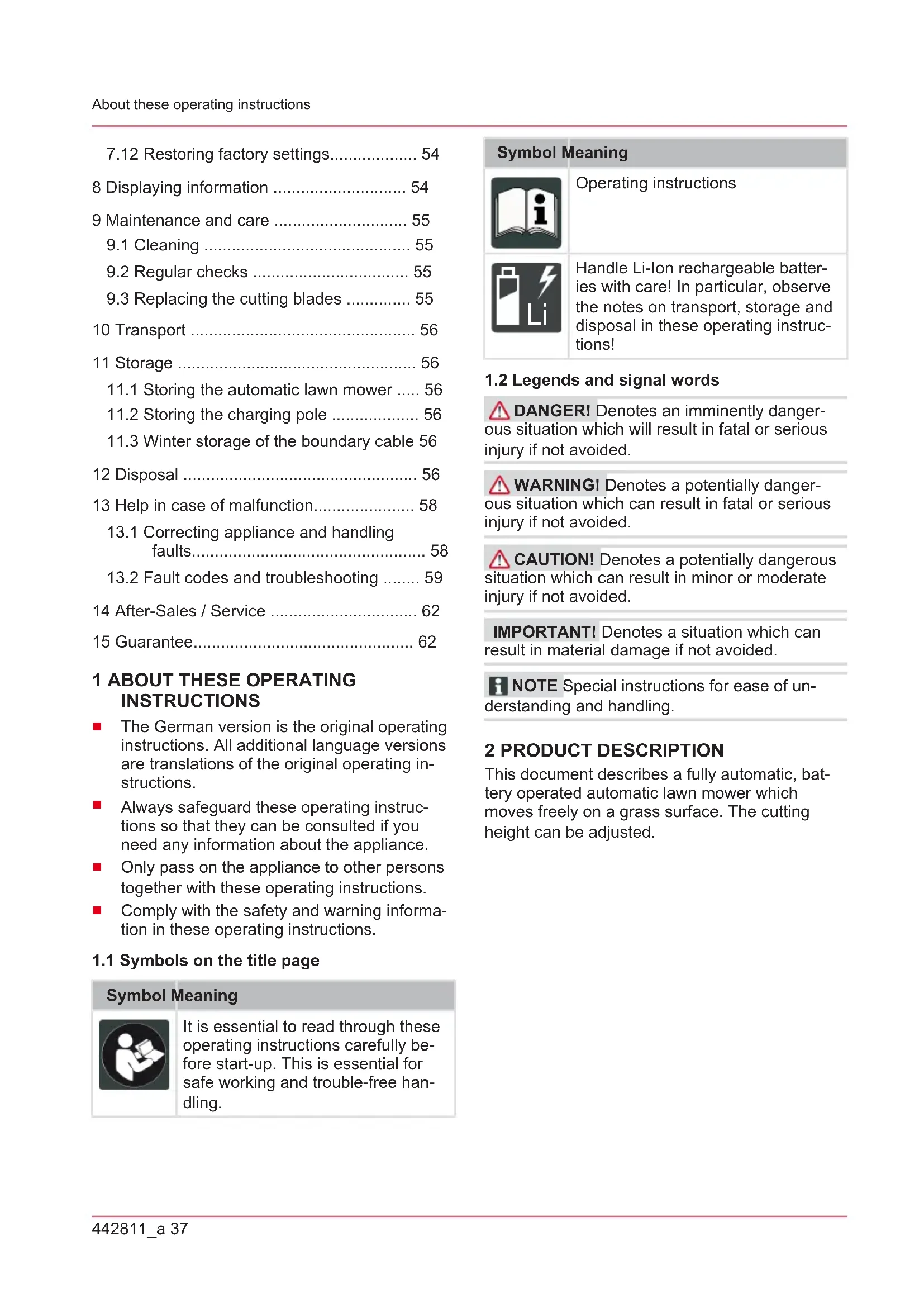 DANGER! Denotes an imminently danger- ous situation which will result in fatal or serious injury if not avoided. WARNING! Denotes a potentially danger- ous situation which can result in fatal or serious injury if not avoided. CAUTION! Denotes a potentially dangerous situation which can result in minor or moderate injury if not avoided. IMPORTANT! Denotes a situation which can result in material damage if not avoided. NOTE Special instructions for ease of un- derstanding and handling. 2 PRODUCT DESCRIPTION This document describes a fully automatic, bat- tery operated automatic lawn mower which moves freely on a grass surface. The cutting height can be adjusted.GB 38 Robolinho Product description