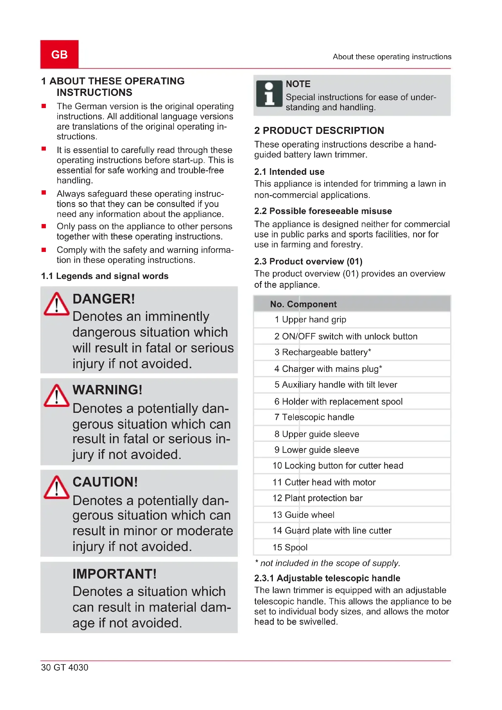 DANGER! Denotes an imminently dangerous situation which will result in fatal or serious injury if not avoided. WARNING! Denotes a potentially dan- gerous situation which can result in fatal or serious in- jury if not avoided. CAUTION! Denotes a potentially dan- gerous situation which can result in minor or moderate injury if not avoided. IMPORTANT! Denotes a situation which can result in material dam- age if not avoided. NOTE Special instructions for ease of under- standing and handling. 2 PRODUCT DESCRIPTION These operating instructions describe a hand- guided battery lawn trimmer.
