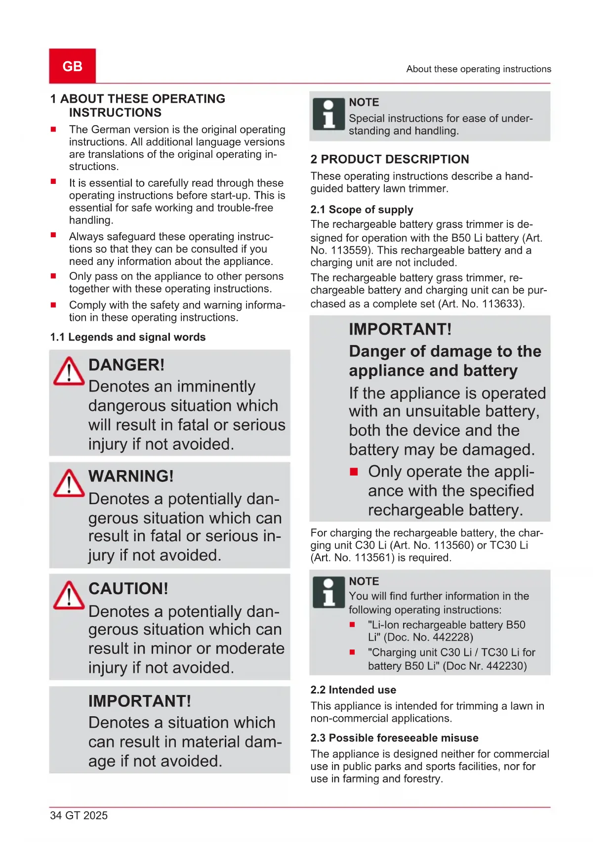 DANGER! Denotes an imminently dangerous situation which will result in fatal or serious injury if not avoided. WARNING! Denotes a potentially dan- gerous situation which can result in fatal or serious in- jury if not avoided. CAUTION! Denotes a potentially dan- gerous situation which can result in minor or moderate injury if not avoided. IMPORTANT! Denotes a situation which can result in material dam- age if not avoided. NOTE Special instructions for ease of under- standing and handling. 2 PRODUCT DESCRIPTION These operating instructions describe a hand- guided battery lawn trimmer.