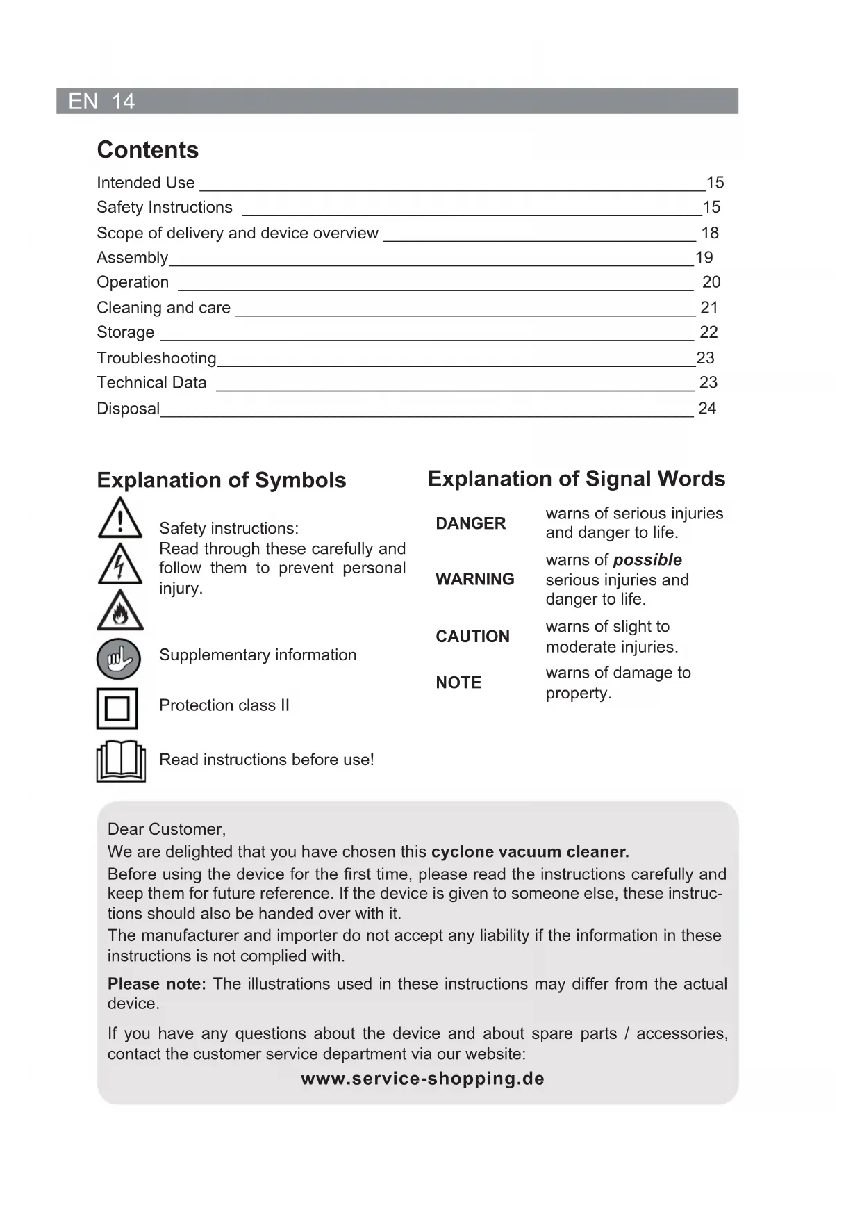 - The following are excluded from the warranty: all defects caused by improper han- dling, damage or unauthorised attempts at repair. This also applies to normal wear and tear. Safety Instructions ■ This device may be used by children aged 8 and over and by people with reduced physical, sensory or mental abilities or a lack of experience and/or knowledge if they are supervised or have received instruction on how to use the device safely and have understood the dangers resulting from failure to comply with the relevant safety precautions. ■ Children must not play with the device. ■ Cleaning and user maintenance may not be performed by children, unless they are older than 8 years of age and are supervised. ■ Children younger than 8 years of age and animals must be kept away from the device and the mains cable. ■ The device must always be disconnected from the mains power when it is left unattended and before assembling, disassembling or cleaning the device. ■ Never immerse the device, mains cable or mains plug in water or other liquids and ensure that they cannot fall into water or become wet. ■ In the interest of your own safety, you should inspect the device for damage each time before you use it. The device may only be used if it has no visible signs of damage! If the device, the mains cable or the mains plug of the device is damaged, it must be replaced by the manufacturer, customer service departmentEN 16 or a similarly qualifi ed person (e.g. specialist workshop) in order to avoid any hazards. DANGER – Danger of Electric Shock from Water! ■ Use and store only in closed rooms. ■ Do not use the device in rooms with high humidity. ■ Should the device fall into water, switch off the power supply immediately. Do not at- tempt to pull the device out of the water while it is still connected to the mains power! ■ Never touch the device, mains cable or mains plug with wet hands when these com- ponents are connected to the mains power. ■ Never suck up liquids. Do not pour liquids into the dust container. Keep the motor unit away from moisture or wet conditions! WARNING – Danger of Electric Shock from Damage and Inappropriate Use! ■ Only connect the device to a plug socket with safety contacts that is properly in- stalled and matches the technical data of the device. The plug socket must also be readily accessible after connection so that the connection to the mains can quickly be isolated. ■ Only use suitable extension cables whose technical data is the same as that of the device. ■ Remove the mains plug from the plug socket if a fault occurs during operation or before a thunderstorm. ■ The device must be switched off when inserting or removing the mains plug. Always pull the mains plug and never the mains cable to disconnect the device from the mains power. WARNING – Danger of Injuries! ■ Warning of strangulation! Make sure that the mains cable is always kept out of the reach of small children and animals. ■ Beware of becoming stuck! Keep animals, hair, jewellery, wide clothing, fi ngers and all other body parts away from the nozzles of the device. They could become stuck to the device. Should the vacuum cleaner become stuck, switch the device off immediately. ■ Beware of falling! Make sure that the connected mains cable does not present a trip hazard. WARNING – Danger of Fire! ■ Do not use the device in rooms containing easily ignitable substances or poisonous and explosive fumes. ■ Do not use the device in the vicinity of highly fl ammable materials (curtains, textiles, etc.).17 EN ■ Do not cover the device during operation in order to prevent it from catching fi re. Do not insert anything into the openings of the device and make sure that these do not become clogged. ■ In the event of a fi re: Do not extinguish with water! Smother the fl ames with a fi re- proof blanket or a suitable fi re extinguisher. NOTICE – Risk of Damage to Material and Property ■ Make sure that the mains cable is not squashed, bent or laid over sharp edges and does not come into contact with hot surfaces. Do not wrap the mains cable around the device (danger of the cable breaking). ■ The device should only be used if it has been completely and correctly assembled! The dust container and the fi lters must be inserted and must not be damaged. If the dirt were to get inside the motor unit, this could damage the motor. ■ Note the MAX marking on the dust container. If during use the marking is reached, empty the dust container. The fi lters must also be regularly cleaned in order to pre- vent overloading of the motor. ■ Never pull or carry the device by the mains cable. ■ Protect the device from heat, naked fl ames, freezing temperatures, persistent mois- ture, wet conditions and collisions. ■ Use only original spare parts from the manufacturer. ■ Do not place or lay any heavy objects on the device, the mains adapter or the mains cable.EN 18 Scope of delivery and device overview NOTE! ■ WARNING – Danger of suffocation! Keep children and animals away from the packaging material.