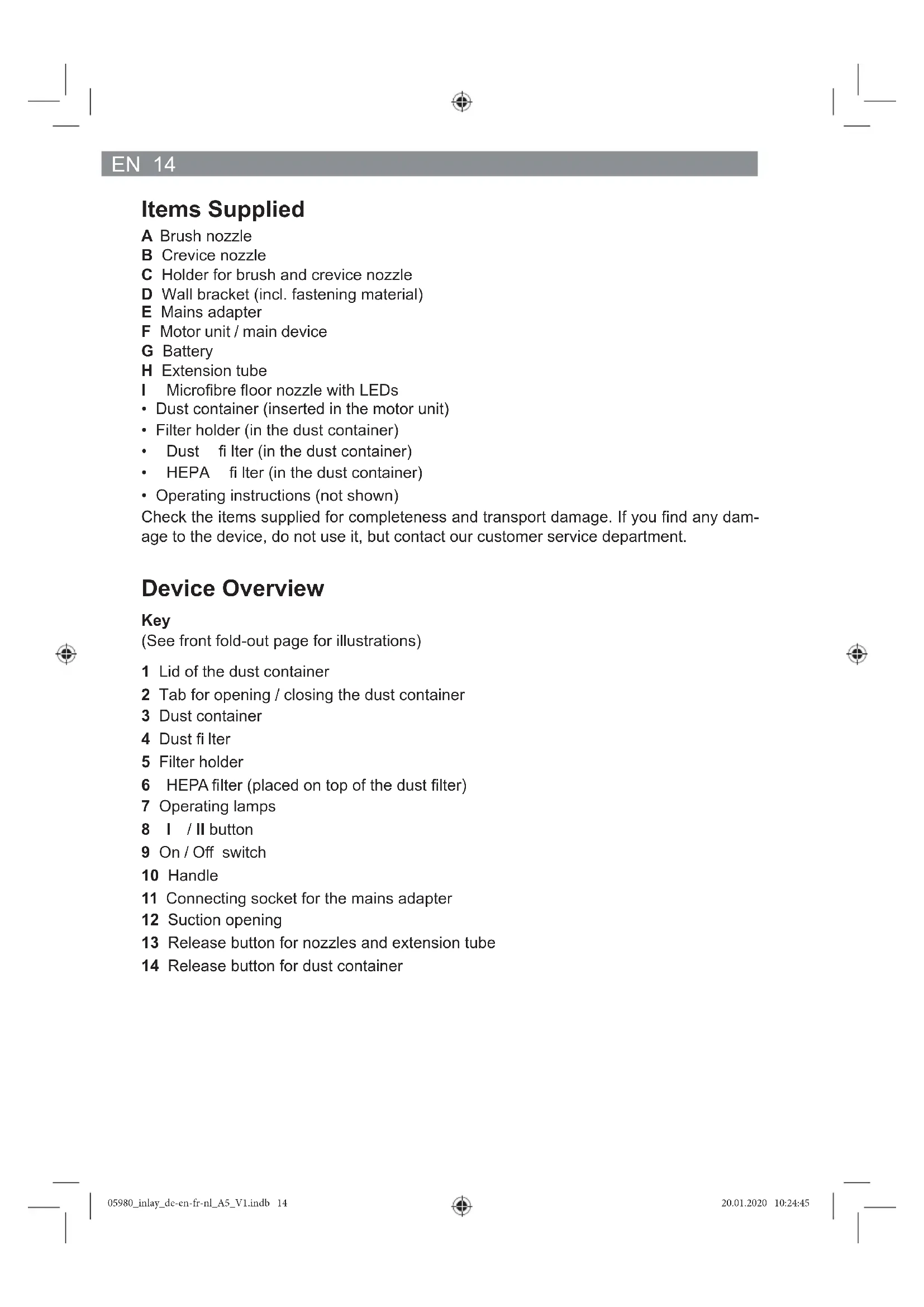 Switching power supply Safe electrical isolation Read operating instructions before use! Explanation of the Signal Words DANGER warns of serious injuries and danger to life WARNING warns of possible serious injuries and danger to life CAUTION warns of slight to moderate injuries NOTICE warns of material damage 05980_inlay_de-en-fr-nl_A5_V1.indb 1305980_inlay_de-en-fr-nl_A5_V1.indb 13 20.01.2020 10:24:4420.01.2020 10:24:44EN 14 Items Supplied A Brush nozzle B Crevice nozzle C Holder for brush and crevice nozzle D Wall bracket (incl. fastening material) E Mains adapter F Motor unit / main device G Battery H Extension tube I Microfi bre fl oor nozzle with LEDs