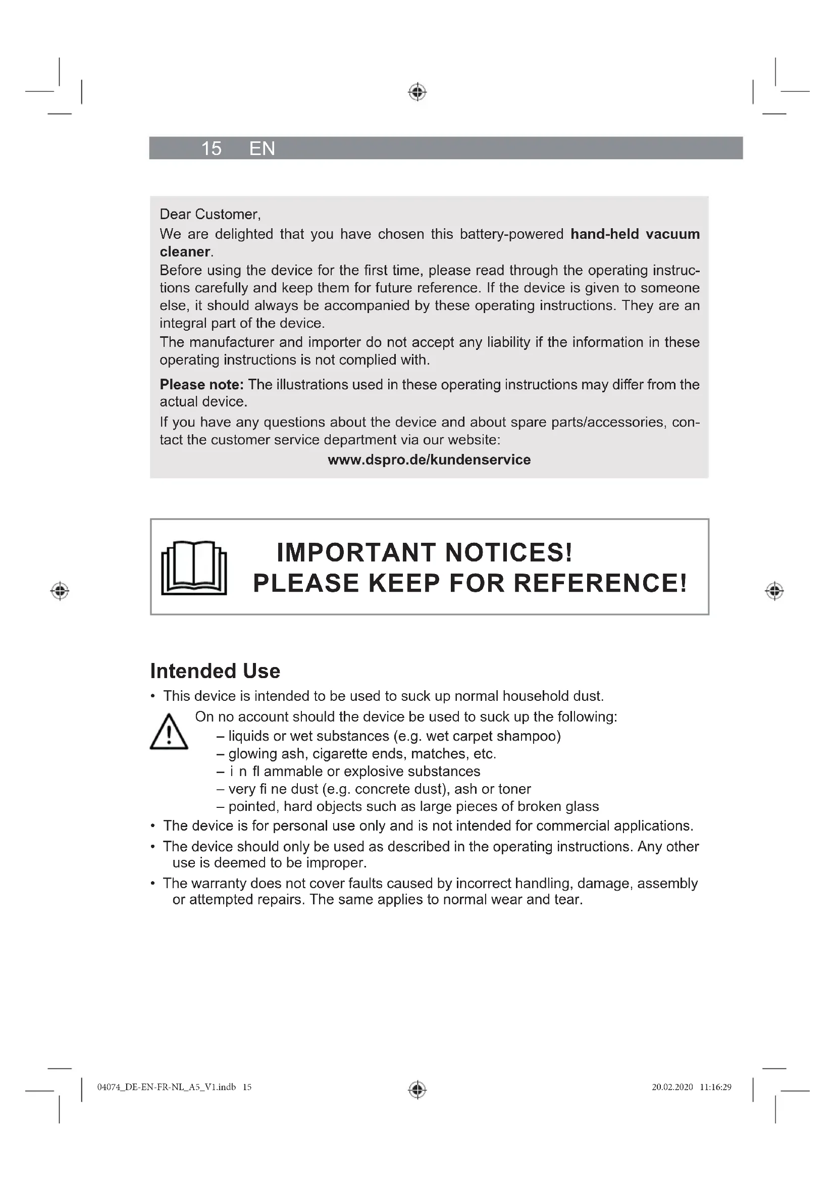 - The warranty does not cover faults caused by incorrect handling, damage, assembly or attempted repairs. The same applies to normal wear and tear. Dear Customer, We are delighted that you have chosen this battery-powered hand-held vacuum cleaner. Before using the device for the fi rst time, please read through the operating instruc- tions carefully and keep them for future reference. If the device is given to someone else, it should always be accompanied by these operating instructions. They are an integral part of the device. The manufacturer and importer do not accept any liability if the information in these operating instructions is not complied with. Please note: The illustrations used in these operating instructions may diff er from the actual device. If you have any questions about the device and about spare parts/accessories, con- tact the customer service department via our website: www.dspro.de/kundenservice IMPORTANT NOTICES! PLEASE KEEP FOR REFERENCE! 04074_DE-EN-FR-NL_A5_V1.indb 1504074_DE-EN-FR-NL_A5_V1.indb 15 20.02.2020 11:16:2920.02.2020 11:16:29EN 16 Safety Notices