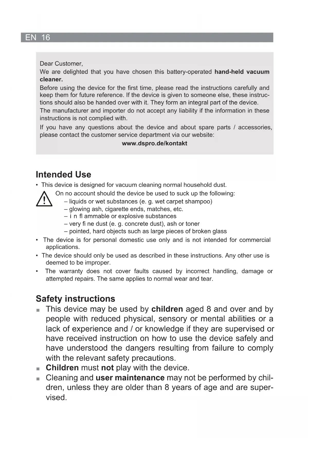 - The warranty does not cover faults caused by incorrect handling, damage or attempted repairs. The same applies to normal wear and tear. Safety instructions ■ This device may be used by children aged 8 and over and by people with reduced physical, sensory or mental abilities or a lack of experience and / or knowledge if they are supervised or have received instruction on how to use the device safely and have understood the dangers resulting from failure to comply with the relevant safety precautions. ■ Children must not play with the device. ■ Cleaning and user maintenance may not be performed by chil- dren, unless they are older than 8 years of age and are super- vised. Dear Customer, We are delighted that you have chosen this battery-operated hand-held vacuum cleaner. Before using the device for the fi rst time, please read the instructions carefully and keep them for future reference. If the device is given to someone else, these instruc- tions should also be handed over with it. They form an integral part of the device. The manufacturer and importer do not accept any liability if the information in these instructions is not complied with. If you have any questions about the device and about spare parts / accessories, please contact the customer service department via our website: www.dspro.de/kontakt17 EN ■ Children younger than 8 years of age and animals must be kept away from the device and the mains adapter. ■ The device must always be switched off when it is not being used and before assembling, disassembling or cleaning the device. ■ Never immerse the device, the charger or the mains adapter in water or other liquids and ensure that they cannot fall into water or become wet. ■ Only ever charge up the rechargeable battery using the charg- ing station and the mains adapter supplied with the device. Do not use the charging station or mains adapter supplied with the device to charge up any other devices. ■ In the interests of your own safety, you should inspect the de- vice for damage each time before you use it. The device may only be used if it has no visible signs of damage! If the device or the mains adapter of the device are damaged, they must be replaced by the manufacturer, customer service department or a similarly qualifi ed person (e. g. specialist workshop) in order to avoid any hazards. DANGER – Risk of Electric Shock! ■ Use and store only in closed rooms. ■ Do not use the device in rooms with high humidity. ■ Never touch the charging station and the mains adapter with wet hands when these components are connected to the mains power. ■ Never suck up liquids. Do not pour liquids into the dust container. Keep the motor unit away from moisture or wet conditions! ■ If the device is to be used as a hand-held vacuum cleaner for cleaning a car, ensure that the device is not exposed to rain or moisture. WARNING – Danger of Injury! ■ Danger of suffocation! Keep children and animals away from the packaging material. ■ Danger of strangulation! Make sure that the mains adapter cable is always kept out of the reach of small children and animals. ■ Danger of burns! If the battery has leaked, do not allow your skin, eyes and mucous membranes to come into contact with the battery acid. If you touch battery acid, rinse the affected sites with abundant fresh water immediately and contact a doctor as soon as possible.EN 18 ■ Danger of becoming stuck! Keep animals, hair, jewellery, wide clothing, fi ngers and all other body parts away from the nozzles of the device. They could become stuck to the device. Should the vacuum cleaner become stuck, switch the device off immediately. ■ Danger of tripping! Make sure that the connected mains adapter does not present a trip hazard. WARNING – Danger of Fire! ■ Do not use the device in rooms containing easily ignitable substances or poisonous and explosive fumes. ■ Do not use the wall bracket with charging station in the vicinity of highly fl ammable materials (curtains, textiles, etc.). ■ Do not cover the device during operation or charging in order to prevent it from catch- ing fi re. Do not insert anything into the ventilation openings of the device and make sure that these do not become clogged. ■ In the event of a fi re: Do not extinguish with water! Smother the fl ames with a fi reproof blanket or a suitable fi re extinguisher. NOTICE – Risk of Damage to Material and Property ■ Only connect the mains adapter to a socket with safety contacts that is properly installed and matches the technical data of the device. The socket must also be readily accessible after connection so that the connection to the mains can quickly be isolated. ■ Remove the mains adapter from the plug socket if a fault occurs during charging or before a thunderstorm. ■ When you pull it out of the socket, always pull on the mains adapter and never the cable! ■ Make sure that the mains adapter cable is not squashed, bent or laid over sharp edges and does not come into contact with hot surfaces. Do not wrap the cable around the mains adapter (danger of the cable breaking). ■ The device should only be used if it has been completely and correctly assembled! The dust container, the cyclone insert and the motor fi lters must be inserted and must not be damaged! If dirt were to get inside the motor unit, this could damage the motor. ■ Protect the device from heat, naked fl ames, sub-zero temperatures, persistent mois- ture, wet conditions and impacts. ■ Use only original spare parts from the manufacturer. ■ Do not place or lay any heavy objects on the device, the mains adapter or the cable of the mains adapter. NOTICE – Risk of Damage to Material and Property from Batteries ■ Use only the battery type specifi ed in the technical data. ■ Remove a dead battery from the device immediately. Clean the contacts before a new battery is inserted. ■ The battery must not be taken apart, thrown into a fi re, immersed i