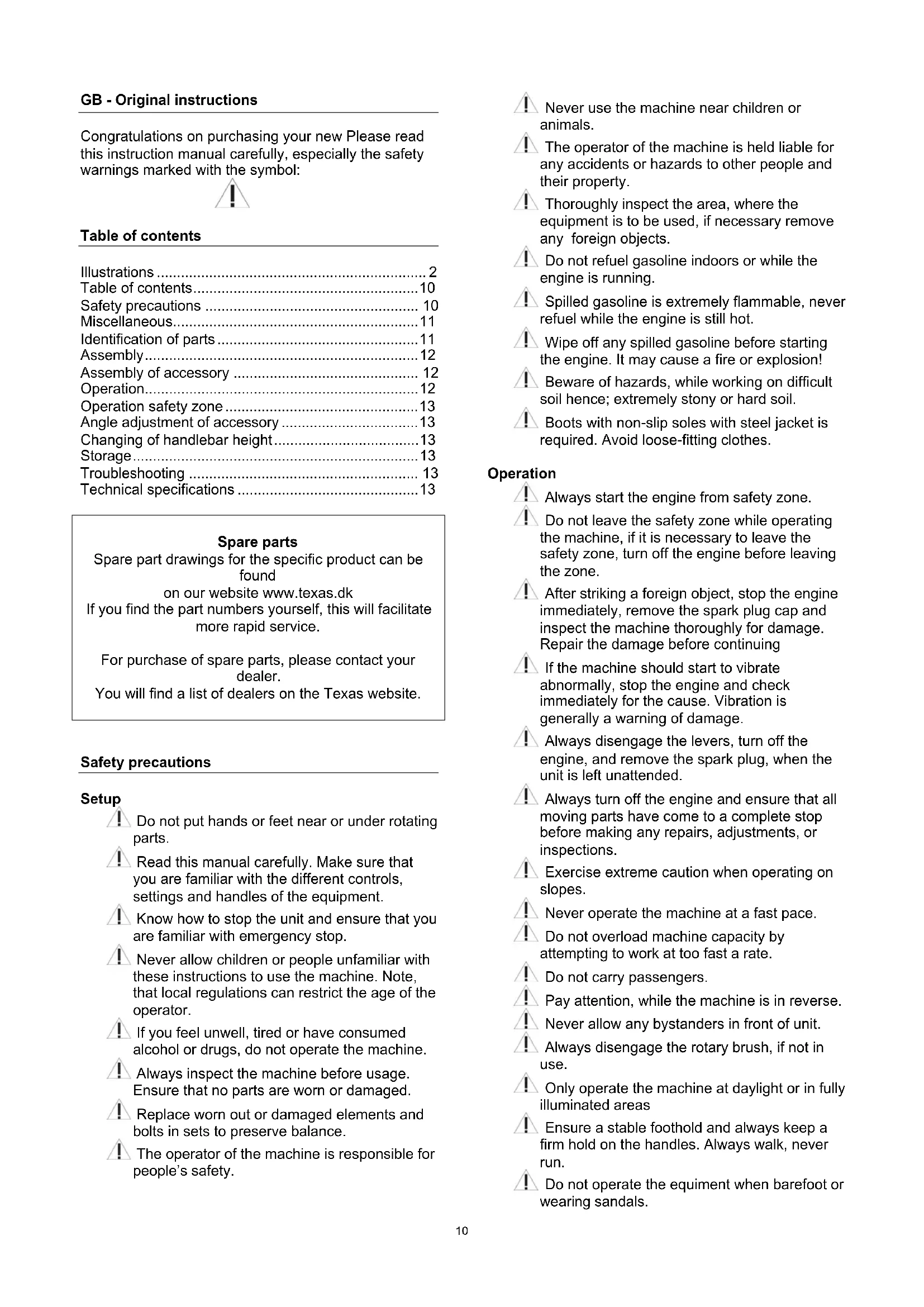 Safety precautions Setup Do not put hands or feet near or under rotating parts. Read this manual carefully. Make sure that you are familiar with the different controls, settings and handles of the equipment. Know how to stop the unit and ensure that you are familiar with emergency stop. Never allow children or people unfamiliar with these instructions to use the machine. Note, that local regulations can restrict the age of the operator. If you feel unwell, tired or have consumed alcohol or drugs, do not operate the machine. Always inspect the machine before usage. Ensure that no parts are worn or damaged. Replace worn out or damaged elements and bolts in sets to preserve balance. The operator of the machine is responsible for people’s safety. Never use the machine near children or animals. The operator of the machine is held liable for any accidents or hazards to other people and their property. Thoroughly inspect the area, where the equipment is to be used, if necessary remove any foreign objects. Do not refuel gasoline indoors or while the engine is running. Spilled gasoline is extremely flammable, never refuel while the engine is still hot. Wipe off any spilled gasoline before starting the engine. It may cause a fire or explosion! Beware of hazards, while working on difficult soil hence; extremely stony or hard soil. Boots with non-slip soles with steel jacket is required. Avoid loose-fitting clothes. Operation Always start the engine from safety zone. Do not leave the safety zone while operating the machine, if it is necessary to leave the safety zone, turn off the engine before leaving the zone. After striking a foreign object, stop the engine immediately, remove the spark plug cap and inspect the machine thoroughly for damage. Repair the damage before continuing If the machine should start to vibrate abnormally, stop the engine and check immediately for the cause. Vibration is generally a warning of damage. Always disengage the levers, turn off the engine, and remove the spark plug, when the unit is left unattended. Always turn off the engine and ensure that all moving parts have come to a complete stop before making any repairs, adjustments, or inspections. Exercise extreme caution when operating on slopes. Never operate the machine at a fast pace. Do not overload machine capacity by attempting to work at too fast a rate. Do not carry passengers. Pay attention, while the machine is in reverse. Never allow any bystanders in front of unit. Always disengage the rotary brush, if not in use. Only operate the machine at daylight or in fully illuminated areas Ensure a stable foothold and always keep a firm hold on the handles. Always walk, never run. Do not operate the equiment when barefoot or wearing sandals.11