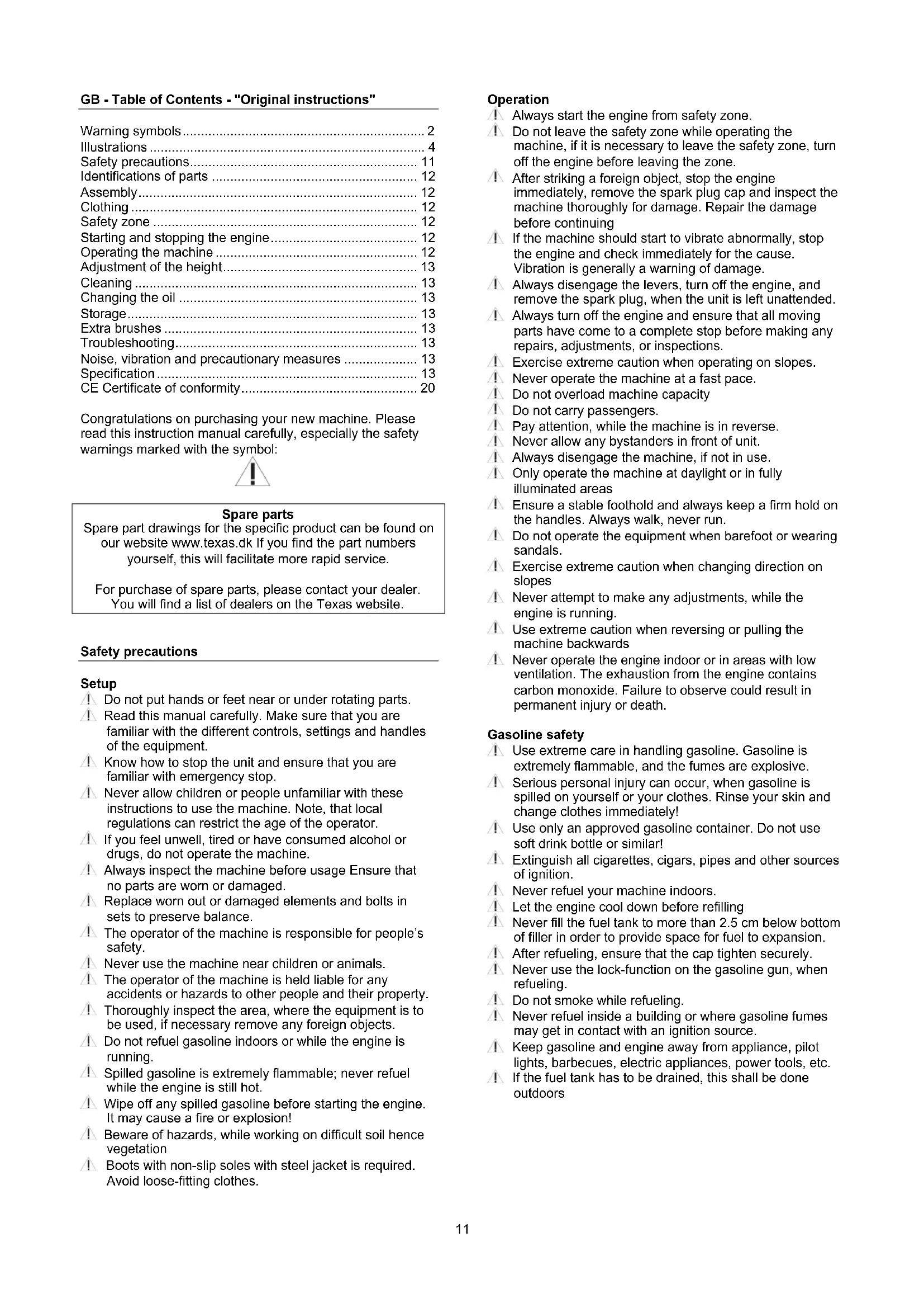 Safety precautions Setup Do not put hands or feet near or under rotating parts. Read this manual carefully. Make sure that you are familiar with the different controls, settings and handles of the equipment. Know how to stop the unit and ensure that you are familiar with emergency stop. Never allow children or people unfamiliar with these instructions to use the machine. Note, that local regulations can restrict the age of the operator. If you feel unwell, tired or have consumed alcohol or drugs, do not operate the machine. Always inspect the machine before usage Ensure that no parts are worn or damaged. Replace worn out or damaged elements and bolts in sets to preserve balance. The operator of the machine is responsible for people’s safety. Never use the machine near children or animals. The operator of the machine is held liable for any accidents or hazards to other people and their property. Thoroughly inspect the area, where the equipment is to be used, if necessary remove any foreign objects. Do not refuel gasoline indoors or while the engine is running. Spilled gasoline is extremely flammable; never refuel while the engine is still hot. Wipe off any spilled gasoline before starting the engine. It may cause a fire or explosion! Beware of hazards, while working on difficult soil hence vegetation Boots with non-slip soles with steel jacket is required. Avoid loose-fitting clothes. Operation Always start the engine from safety zone. Do not leave the safety zone while operating the machine, if it is necessary to leave the safety zone, turn off the engine before leaving the zone. After striking a foreign object, stop the engine immediately, remove the spark plug cap and inspect the machine thoroughly for damage. Repair the damage before continuing If the machine should start to vibrate abnormally, stop the engine and check immediately for the cause. Vibration is generally a warning of damage. Always disengage the levers, turn off the engine, and remove the spark plug, when the unit is left unattended. Always turn off the engine and ensure that all moving parts have come to a complete stop before making any repairs, adjustments, or inspections. Exercise extreme caution when operating on slopes. Never operate the machine at a fast pace. Do not overload machine capacity Do not carry passengers. Pay attention, while the machine is in reverse. Never allow any bystanders in front of unit. Always disengage the machine, if not in use. Only operate the machine at daylight or in fully illuminated areas Ensure a stable foothold and always keep a firm hold on the handles. Always walk, never run. Do not operate the equipment when barefoot or wearing sandals. Exercise extreme caution when changing direction on slopes Never attempt to make any adjustments, while the engine is running. Use extreme caution when reversing or pulling the machine backwards Never operate the engine indoor or in areas with low ventilation. The exhaustion from the engine contains carbon monoxide. Failure to observe could result in permanent injury or death. Gasoline safety Use extreme care in handling gasoline. Gasoline is extremely flammable, and the fumes are explosive. Serious personal injury can occur, when gasoline is spilled on yourself or your clothes. Rinse your skin and change clothes immediately! Use only an approved gasoline container. Do not use soft drink bottle or similar! Extinguish all cigarettes, cigars, pipes and other sources of ignition. Never refuel your machine indoors. Let the engine cool down before refilling Never fill the fuel tank to more than 2.5 cm below bottom of filler in order to provide space for fuel to expansion. After refueling, ensure that the cap tighten securely. Never use the lock-function on the gasoline gun, when refueling. Do not smoke while refueling. Never refuel inside a building or where gasoline fumes may get in contact with an ignition source. Keep gasoline and engine away from appliance, pilot lights, barbecues, electric appliances, power tools, etc. If the fuel tank has to be drained, this shall be done outdoors12