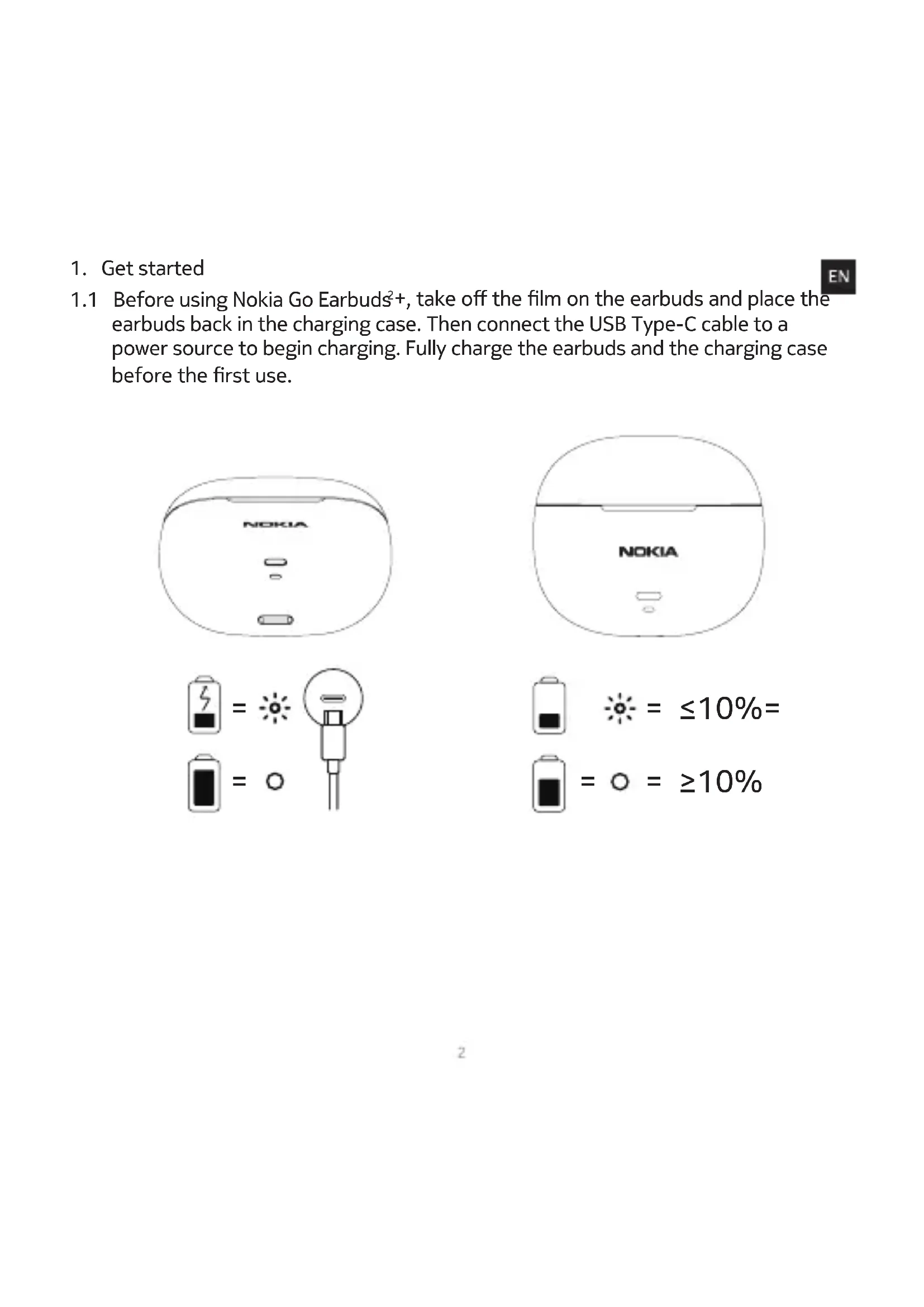 1.1 Before using Nokia Go Earbuds ^2+ , take off the film on the earbuds and place the earbuds back in the charging case. Then connect the USB Type-C cable to a power source to begin charging. Fully charge the earbuds and the charging case before the first use.
