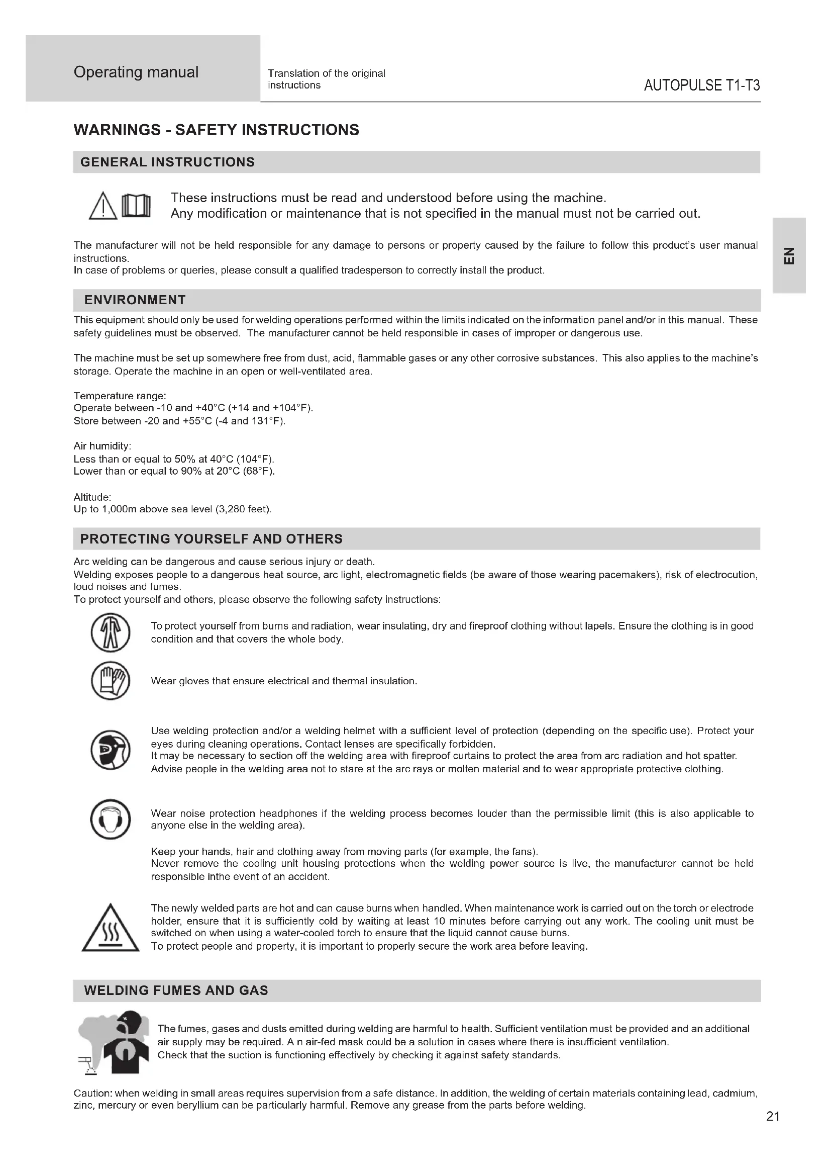 Wear noise protection headphones if the welding process becomes louder than the permissible limit (this is also applicable to anyone else in the welding area).