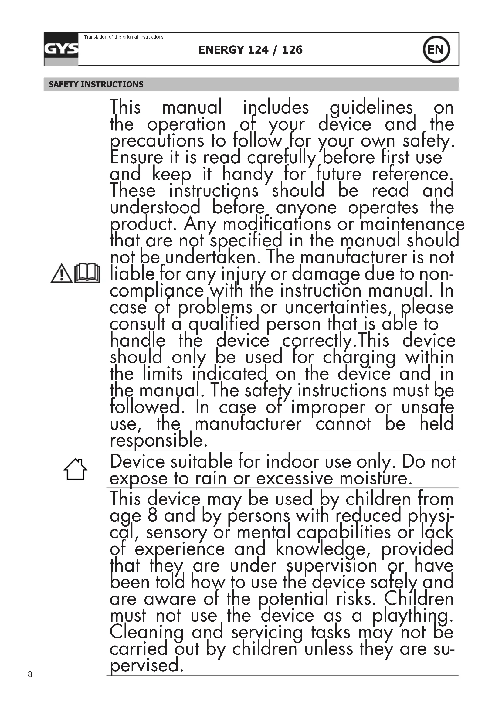 Download the instructions for your Battery charger in PDF format for free! Find your manual Energy 124 - GYS and take your electronic device back in hand. On this page are published all the documents necessary for the use of your device. Energy 124 by GYS.