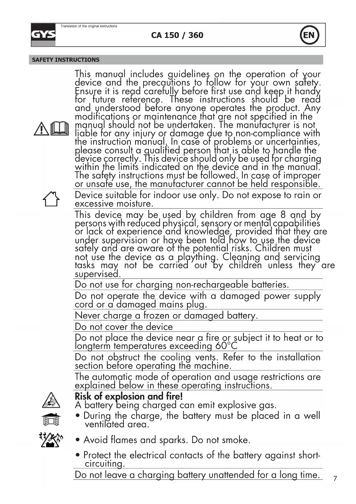 Translation of the original instructions ◊ Thermal protection The charger is tted with a thermostat. If it gets too hot, the charger will stop working. Place the unit in a ventilated room, wait until it cools down to turn the charger on (wait 10-20 minutes) ◊ Fuse The fuse will protect the unit in the following instances: - Polarity reversal or clamps in short-circuit. - Starting the vehicle whilst the battery is connected to the charger. - Charging current is in boost mode for too long or too high and above the nominal current in standard charge mode. In case of a fuse break, disconnect the clamps from the battery, switch the unit o, change the fuse, set the charger to the minimum charge output available and reconnect everything as instructed above. CA 150 CA 360 Primary fuse (No Gys reference for sells) Cylindrical 5×20mm - T3.15A Littelfuse reference : 02153.15MXP (No Gys reference for sells) Cylindrical 5× 20mm - T5A Littelfuse reference : 0215005.MXP Secondary fuse Gys reference : 054516 Type : ATOF blade - 25A Littelfuse reference : 287025.PXPV Gys reference : 054622 Type: BF1 – M5 - 32V 50A Littelfuse reference : 153.5631.5502 Sulfated battery Batteries which have been deeply discharged may be charged/recovered. Such batteries may be identied if the ammeter needle does not (stays at 0) or if the charger stops quickly when in automatic mode. In this event, set the charger to “Manual” (CA 360), set the charger on the fastest charging speed and monitor it every hour. If the needle still hasn’t moved after 5 hours, the battery cannot be recovered. TROUBLESHOOTING Symptoms Causes Remedies The ON/OFF button does not switch on when set to ON. No mains voltage Check that the power cord is plugged to a 230V 50/60Hz socket. Check the power supply network. The machine's anmeter does not uctuate . Power supply problem. Check your mains power supply. Clamps in short circuit or polarity reversal. Check that the fuses have not melted and that the circuit breaker is not tripped The battery that you are trying to charge is faulty. Check the terminals' voltage with a voltmeter. If this voltage jumps instantaneously to 2.5V per element, the battery may be sulfated or damaged. Voltage error (12 -24V) Chck that the switch is on the right setting (12 or 24V) Following intensive use, your device has entered thermal protection mode. Wait 1/4h so the device can cool down. The charger is properly connected but it does not charge the battery Blown fuse Replace the fuse by a new one. Bad clamp connections. Clean the terminals and the clamps. Check the state of the cables and clamps. Wrong charge settings Check that the selected voltage matches the battery voltage. Following intensive use, your device has entered thermal protection mode. Wait 1/4h so the device can cool down.11 CA 150 / 360