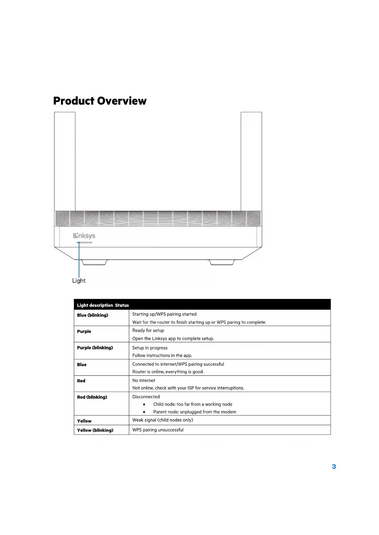 Light description Status Blue (blinking) Starting up/WPS pairing started Wait for the router to finish starting up or WPS paring to complete. Purple Ready for setup Open the Linksys app to complete setup. Purple (blinking) Setup in progress Follow instructions in the app. Blue Connected to internet/WPS pairing successful Router is online, everything is good. Red No internet Not online, check with your ISP for service interruptions. Red (blinking) Disconnected