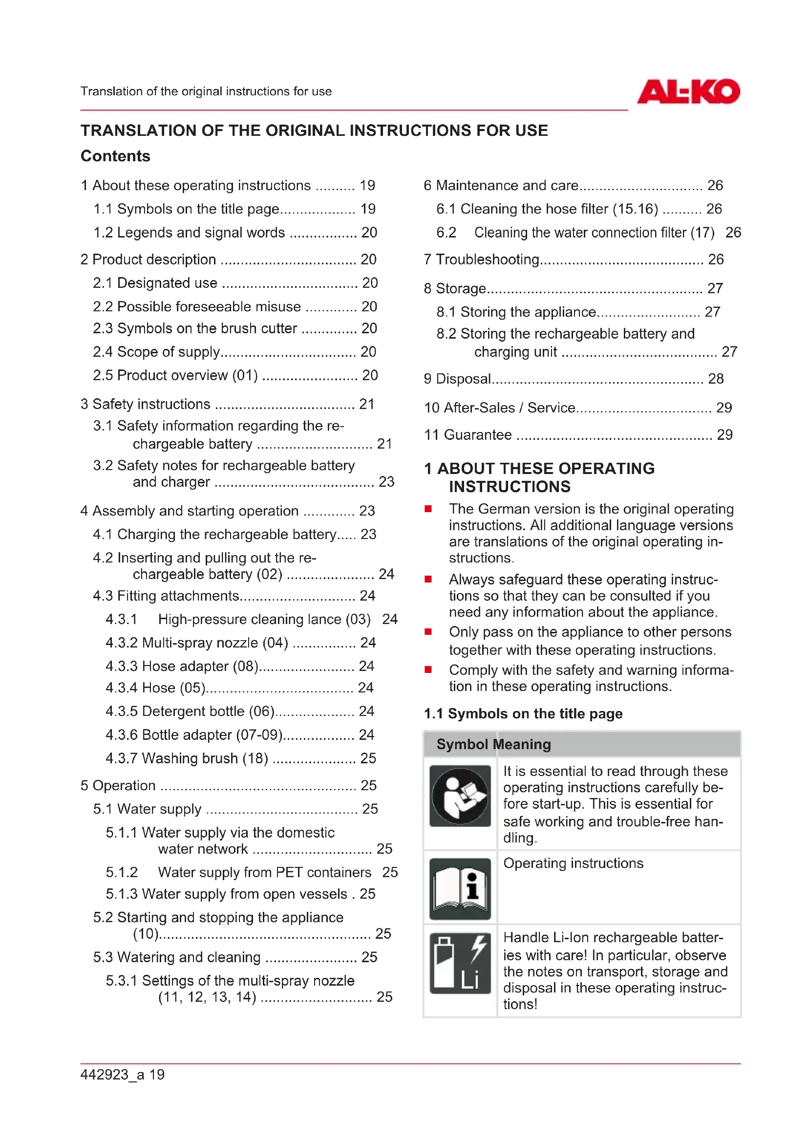 Disposal point of the manufacturer (if not a member of the common take-back system) These statements apply only to rechargeable bat- teries and batteries that are sold in the countries of the European Union and that are subject to European Directive 2006/66/EU. Different provi- sions can apply to the disposal of rechargeable batteries and batteries in countries outside the European Union.442923_a 29 After-Sales / Service 10 AFTER-SALES / SERVICE In the event of questions of warranty, repair or spare parts, please contact your nearest AL-KOService Centre. These can be found on the Internet at: www.al-ko.com/service-contacts 11 GUARANTEE We will resolve any material or manufacturing faults on the appliance during the legal warranty period for claims relating to faults, in accordance with our choice either to repair or replace. The legal warran- ty period is determined by the legislation of the country in which the appliance was purchased. Our warranty promise applies only if: