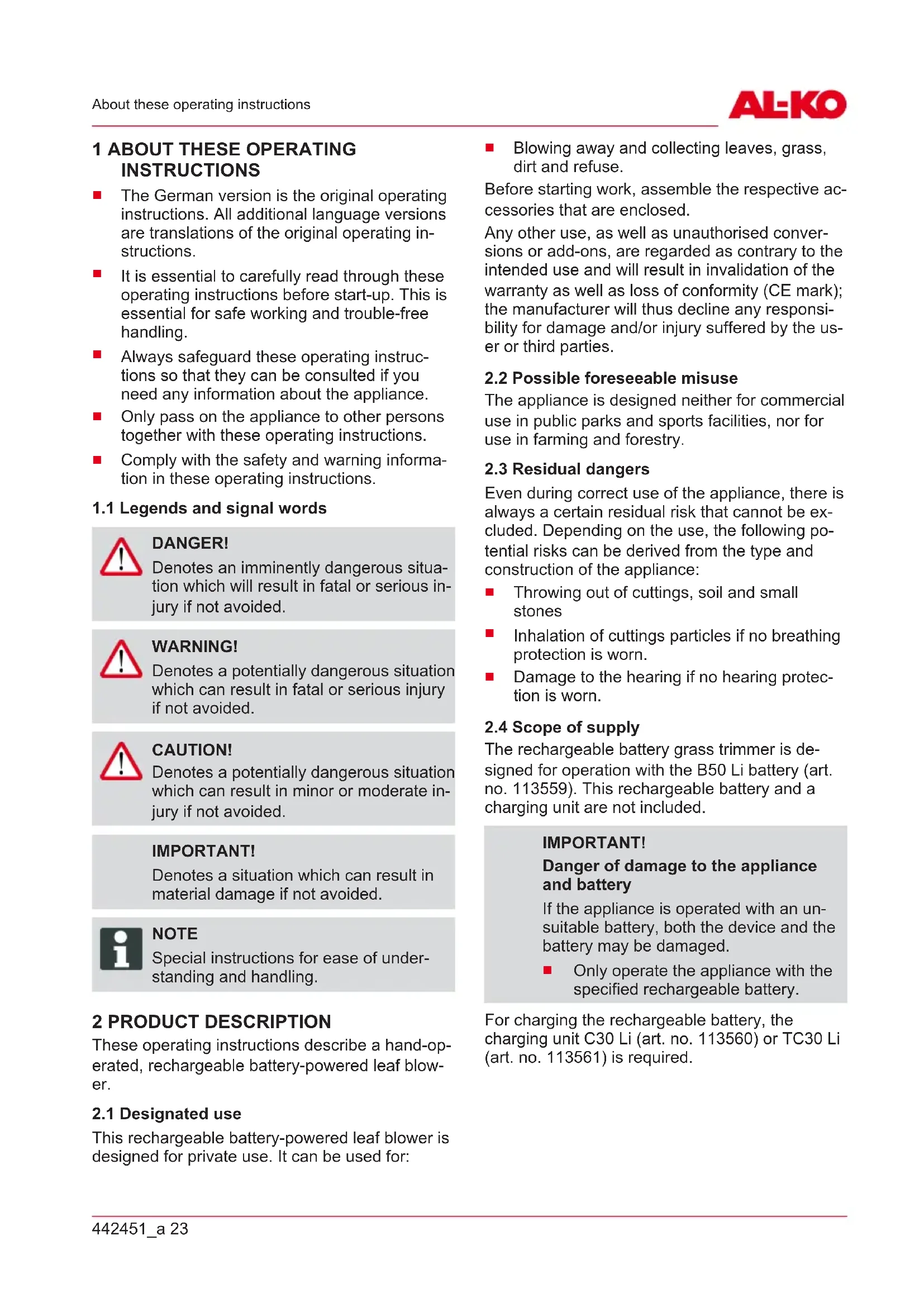 DANGER! Denotes an imminently dangerous situa- tion which will result in fatal or serious in- jury if not avoided. WARNING! Denotes a potentially dangerous situation which can result in fatal or serious injury if not avoided. CAUTION! Denotes a potentially dangerous situation which can result in minor or moderate in- jury if not avoided. IMPORTANT! Denotes a situation which can result in material damage if not avoided. NOTE Special instructions for ease of under- standing and handling. 2 PRODUCT DESCRIPTION These operating instructions describe a hand-op- erated, rechargeable battery-powered leaf blow- er.