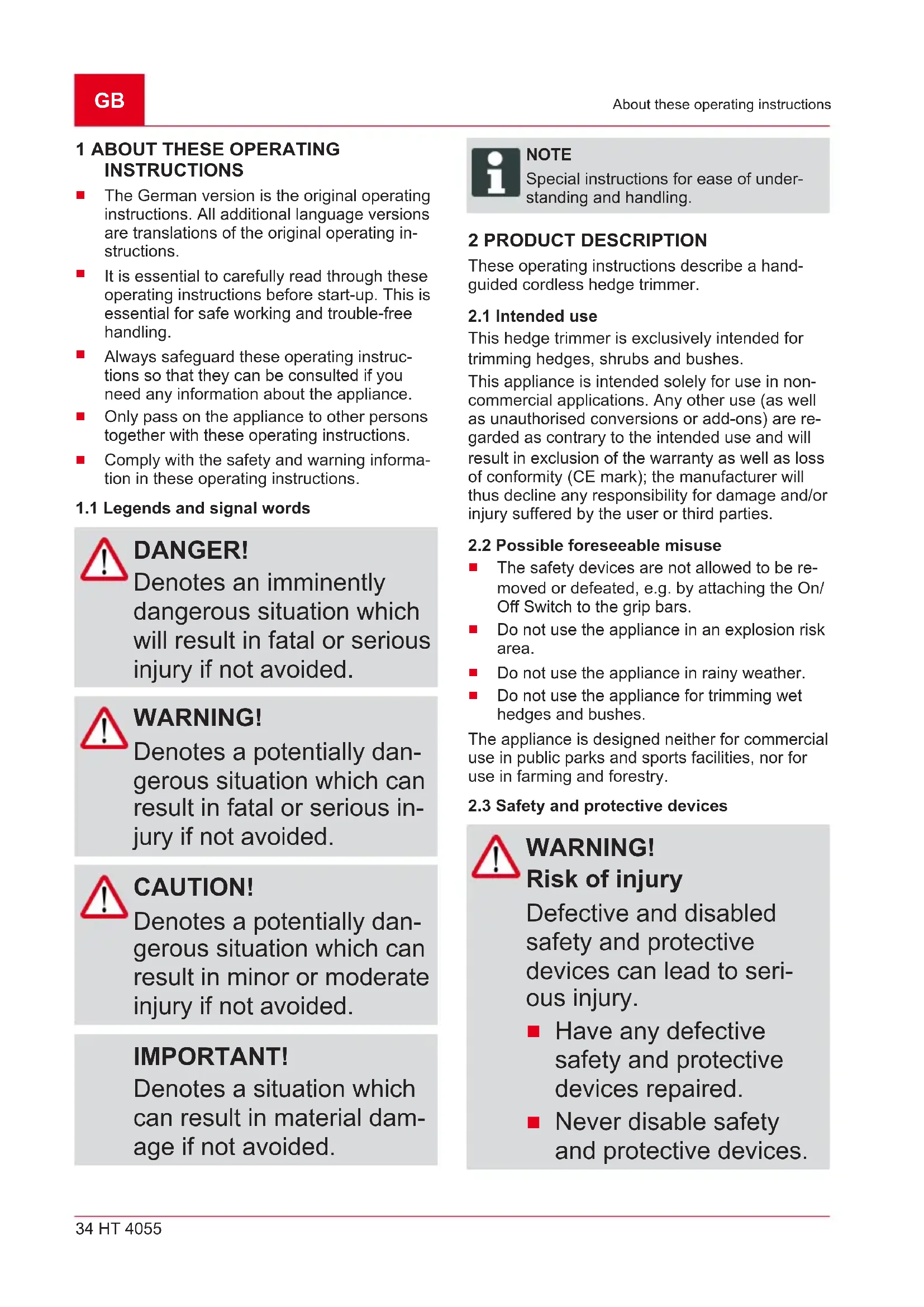 DANGER! Denotes an imminently dangerous situation which will result in fatal or serious injury if not avoided. WARNING! Denotes a potentially dan- gerous situation which can result in fatal or serious in- jury if not avoided. CAUTION! Denotes a potentially dan- gerous situation which can result in minor or moderate injury if not avoided. IMPORTANT! Denotes a situation which can result in material dam- age if not avoided. NOTE Special instructions for ease of under- standing and handling. 2 PRODUCT DESCRIPTION These operating instructions describe a hand- guided cordless hedge trimmer.