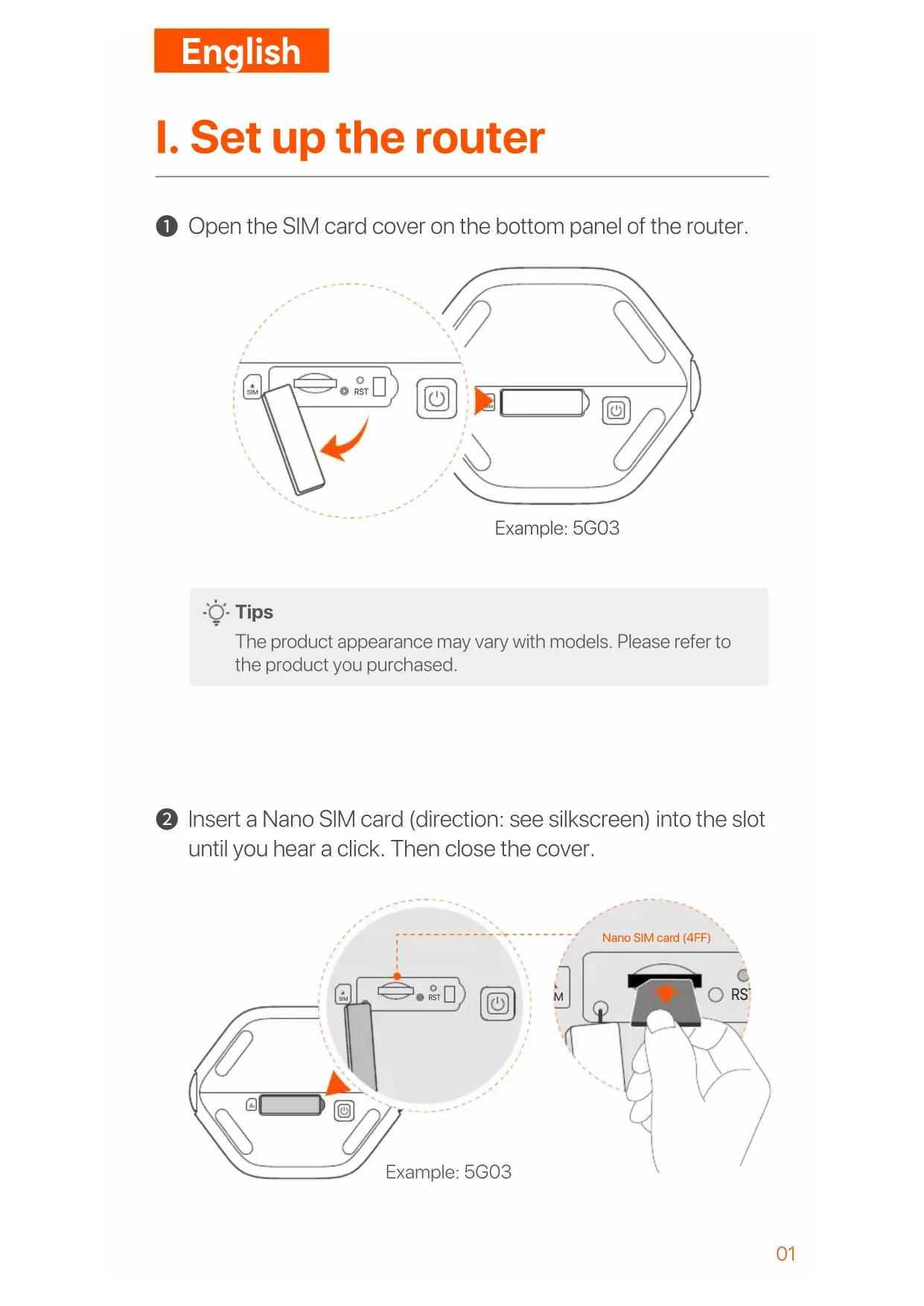 lnsert a Nano SlM card (direction: see silkscreen) into the slot until you hear a click. Then close the cover. SIM SIM RST Example: 5G03 SIM SIM RST SIM RST Nano SIM card (4FF) Example: 5G0302 Tips The product appearance may vary with models. Please refer to the product you purchased. To ensure performance and avoid damage to the SIM card, do not insert or remove the SIM card when the router is running. To remove the SIM card, gently press the SIM card until it clicks. The SIM card will automatically pop out.