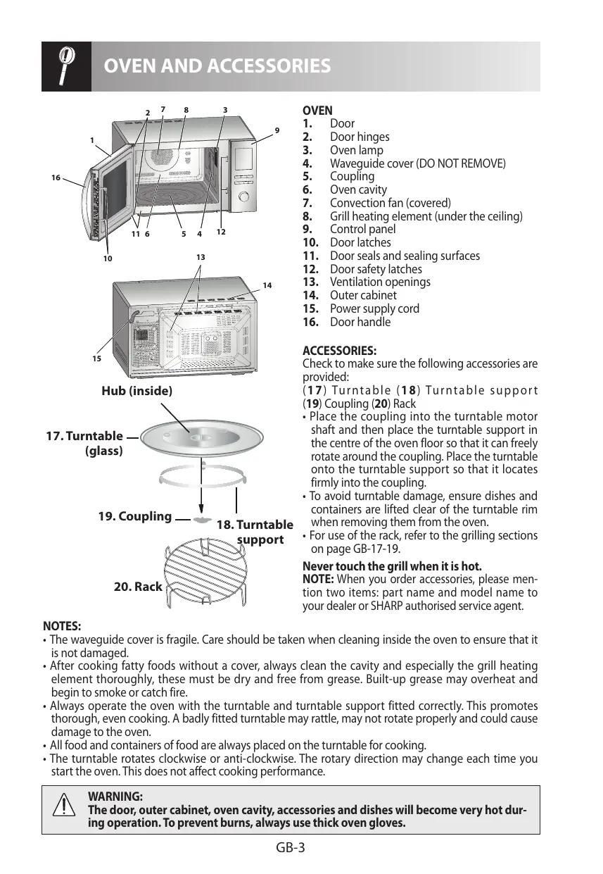 Check to make sure the following accessories are provided: ( 1 7 ) Tu r n t a b l e ( 1 8 ) Tu r n t a b l e s u p p o r t (19) Coupling (20) Rack • Place the coupling into the turntable motor shaft and then place the turntable support in the centre of the oven floor so that it can freely rotate around the coupling. Place the turntable onto the turntable support so that it locates firmly into the coupling. • To avoid turntable damage, ensure dishes and containers are lifted clear of the turntable rim 18. Turntable when removing them from the oven. support • For use of the rack, refer to the grilling sections on page GB-17-19. Never touch the grill when it is hot. NOTE: When you order accessories, please mention two items: part name and model name to your dealer or SHARP authorised service agent.