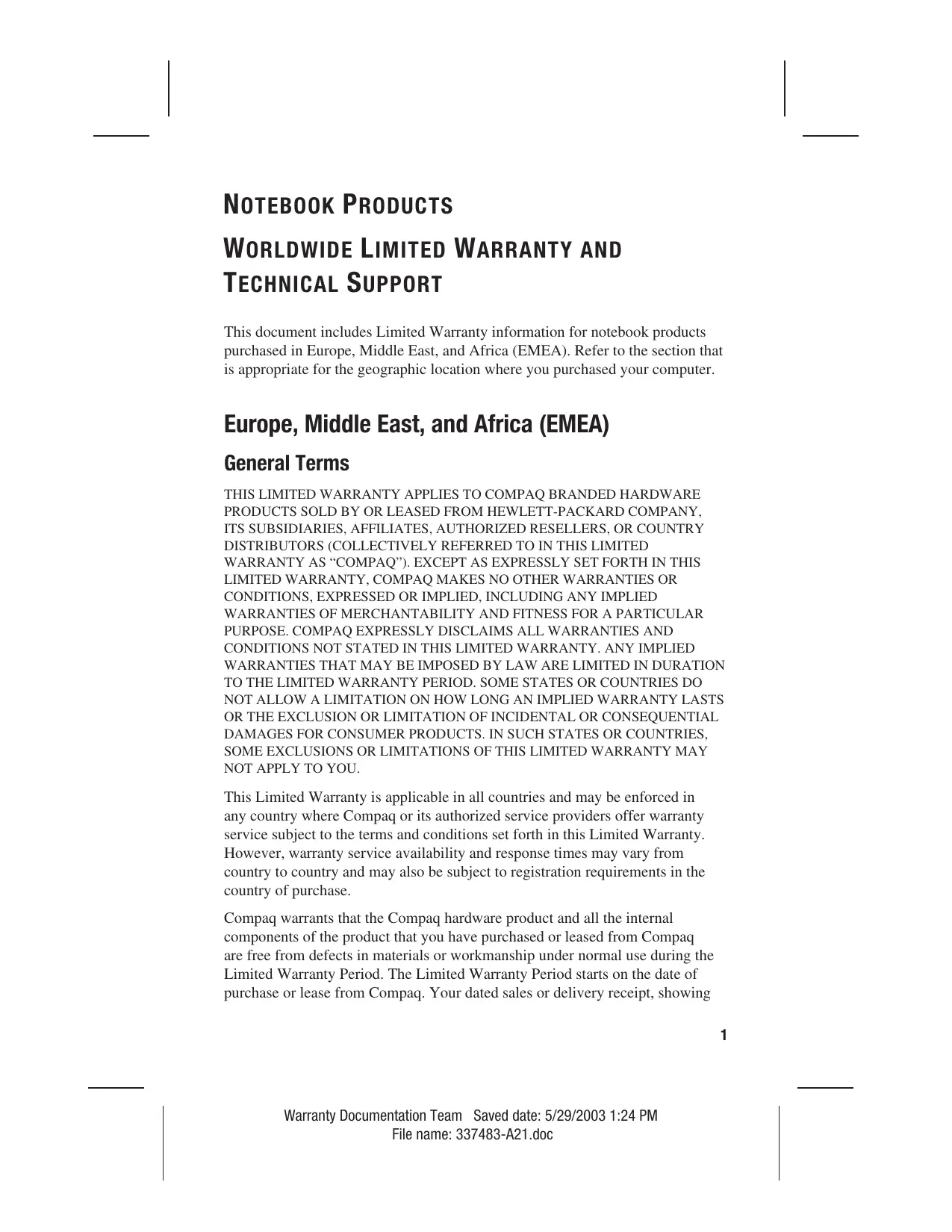 This document includes Limited Warranty information for notebook products purchased in Europe, Middle East, and Africa (EMEA). Refer to the section that is appropriate for the geographic location where you purchased your computer. Europe, Middle East, and Africa (EMEA) General Terms THIS LIMITED WARRANTY APPLIES TO COMPAQ BRANDED HARDWARE PRODUCTS SOLD BY OR LEASED FROM HEWLETT-PACKARD COMPANY, ITS SUBSIDIARIES, AFFILIATES, AUTHORIZED RESELLERS, OR COUNTRY DISTRIBUTORS (COLLECTIVELY REFERRED TO IN THIS LIMITED WARRANTY AS “COMPAQ”). EXCEPT AS EXPRESSLY SET FORTH IN THIS LIMITED WARRANTY, COMPAQ MAKES NO OTHER WARRANTIES OR CONDITIONS, EXPRESSED OR IMPLIED, INCLUDING ANY IMPLIED WARRANTIES OF MERCHANTABILITY AND FITNESS FOR A PARTICULAR PURPOSE. COMPAQ EXPRESSLY DISCLAIMS ALL WARRANTIES AND CONDITIONS NOT STATED IN THIS LIMITED WARRANTY. ANY IMPLIED WARRANTIES THAT MAY BE IMPOSED BY LAW ARE LIMITED IN DURATION TO THE LIMITED WARRANTY PERIOD. SOME STATES OR COUNTRIES DO NOT ALLOW A LIMITATION ON HOW LONG AN IMPLIED WARRANTY LASTS OR THE EXCLUSION OR LIMITATION OF INCIDENTAL OR CONSEQUENTIAL DAMAGES FOR CONSUMER PRODUCTS. IN SUCH STATES OR COUNTRIES, SOME EXCLUSIONS OR LIMITATIONS OF THIS LIMITED WARRANTY MAY NOT APPLY TO YOU. This Limited Warranty is applicable in all countries and may be enforced in any country where Compaq or its authorized service providers offer warranty service subject to the terms and conditions set forth in this Limited Warranty. However, warranty service availability and response times may vary from country to country and may also be subject to registration requirements in the country of purchase. Compaq warrants that the Compaq hardware product and all the internal components of the product that you have purchased or leased from Compaq are free from defects in materials or workmanship under normal use during the Limited Warranty Period. The Limited Warranty Period starts on the date of purchase or lease from Compaq. Your dated sales or delivery receipt, showing