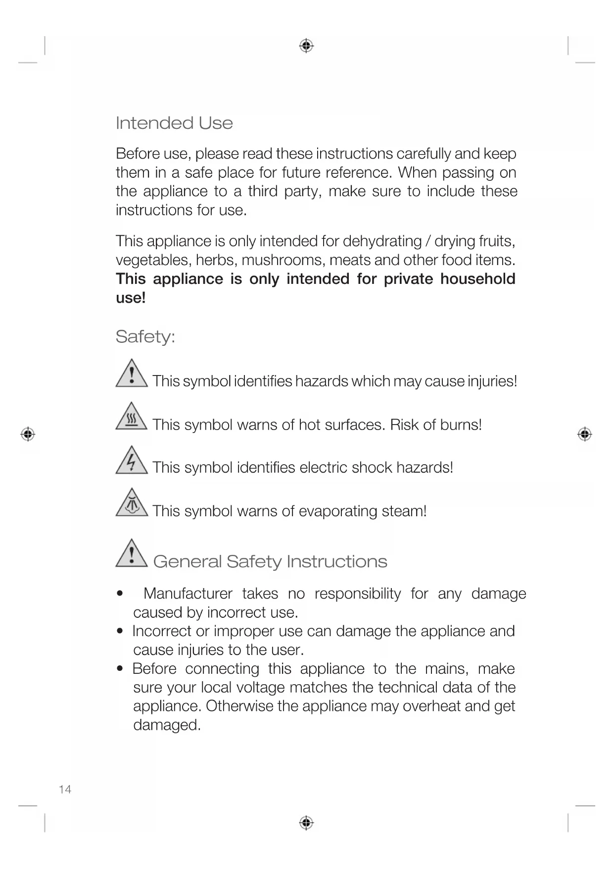- Only use the appliance for its intended purpose and as described in this manual, e.g. dehydrating fruits, vegetables and other food items. Place the appliance on an even and heat-resistant surface.