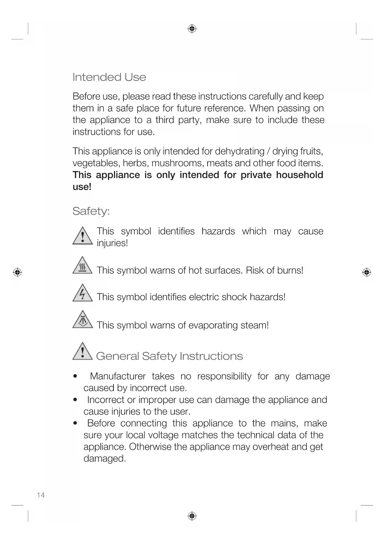This appliance is only intended for dehydrating / drying fruits, vegetables, herbs, mushrooms, meats and other food items. This appliance is only intended for private household use!