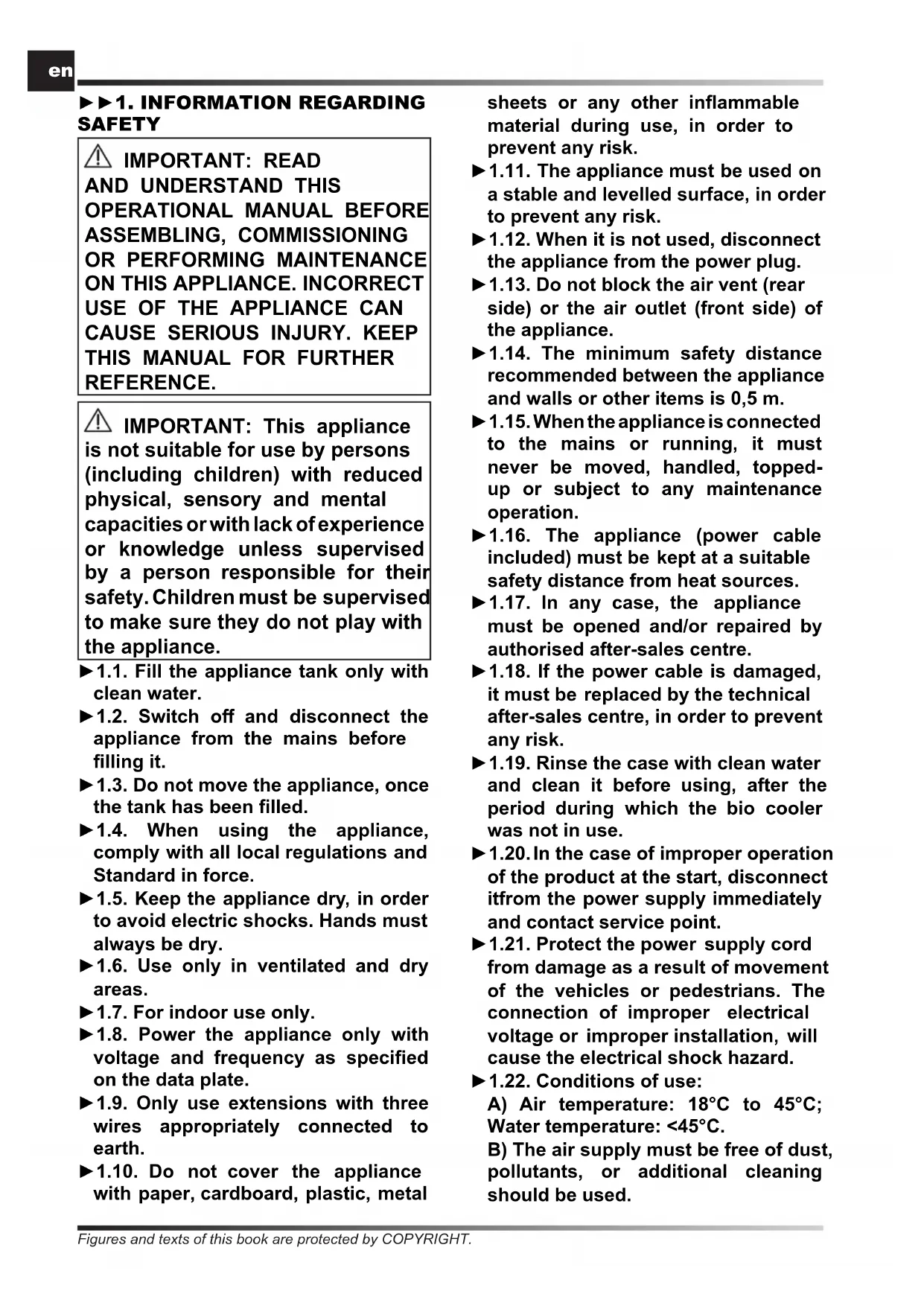 REFERENCE. IMPORTANT: This appliance is not suitable for use by persons (including children) with reduced physical, sensory and mental capacities or with lack of experience or knowledge unless supervised by a person responsible for their safety. Children must be supervised to make sure they do not play with the appliance. ►1.1. Fill the appliance tank only with clean water. ►1.2. Switch o and disconnect the appliance from the mains before lling it. ►1.3. Do not move the appliance, once the tank has been lled. ►1.4. When using the appliance, comply with all local regulations and Standard in force. ►1.5. Keep the appliance dry, in order to avoid electric shocks. Hands must always be dry. ►1.6. Use only in ventilated and dry areas. ►1.7. For indoor use only. ►1.8. Power the appliance only with voltage and frequency as specied on the data plate. ►1.9. Only use extensions with three wires appropriately connected to earth. ►1.10. Do not cover the appliance with paper, cardboard, plastic, metal sheets or any other inammable material during use, in order to prevent any risk. ►1.11. The appliance must be used on a stable and levelled surface, in order to prevent any risk. ►1.12. When it is not used, disconnect the appliance from the power plug. ►1.13. Do not block the air vent (rear side) or the air outlet (front side) of the appliance. ►1.14. The minimum safety distance recommended between the appliance and walls or other items is 0,5 m. ►1.15. When the appliance is connected to the mains or running, it must never be moved, handled, topped- up or subject to any maintenance operation. ►1.16. The appliance (power cable included) must be kept at a suitable safety distance from heat sources. ►1.17. In any case, the appliance must be opened and/or repaired by authorised after-sales centre. ►1.18. If the power cable is damaged, it must be replaced by the technical after-sales centre, in order to prevent any risk. ►1.19. Rinse the case with clean water and clean it before using, after the period during which the bio cooler was not in use. ►1.20. In the case of improper operation of the product at the start, disconnect itfrom the power supply immediately and contact service point. ►1.21. Protect the power supply cord from damage as a result of movement of the vehicles or pedestrians. The connection of improper electrical voltage or improper installation, will cause the electrical shock hazard. ►1.22. Conditions of use: A) Air temperature: 18°C to 45°C; Water temperature: <45°C. B) The air supply must be free of dust, pollutants, or additional cleaning should be used. Figures and texts of this book are protected by COPYRIGHT.en ►1.23. The water used to ll the cooler tank must come from an aqueduct. If it is not possible to draw from an aqueduct, the water introduced must be subjected to a sanitation treat- ment, according to European Direc- tive 98/83/EC. -We recommend using water with a hardness of less than 15°f. -The cooler tank must be emptied and sanitised periodically depending on the use. -The cooling pad surfaces must be periodically inspected and sanitised depending on the use. -For sanitation operations, biocidal products that comply with European regulation no. 582/2012 must be used. ►►2. UNPACKING ►2.1. Remove all packaging materials used to wrap and deliver the appliance and dispose of them in compliance with the Standards in force. ►2.2. Extract all items from the packaging. ►2.3. Verify if damage undergone during transport. If the appliance appears damaged, inform the dealer, where the purchase was made, immediately. ►►3. ASSEMBLY The device is equipped with wheels to facilitate handling. Depending on the model, wheels can be found already installed or not. Components equipped with relative nuts and bolts are found inside the packaging (Fig. 1). ►►4. OPERATION