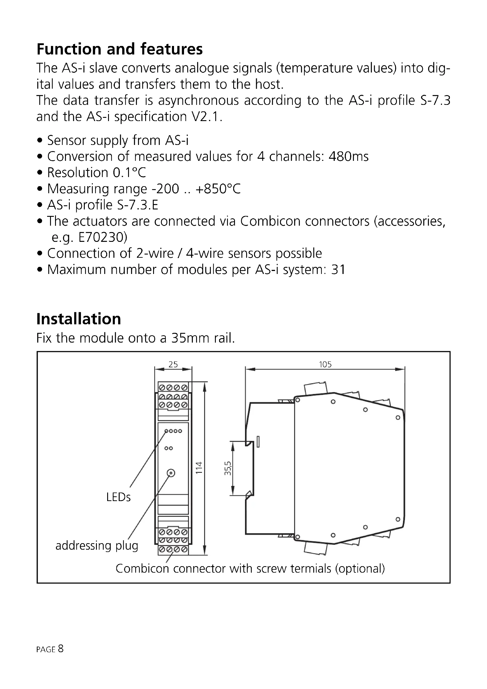 - + terminals are intercon- nected in the module. It is necessary to connect at least one Pt100 sensor before switching on the AS-i slave to start the A/D converter, otherwise the LEDs I1 to I4 flash at a frequency of about 5Hz. Important notes regarding Pt100 measurements: In the Pt100 measurement principle, very low currents flow in the mea- suring electronics. It must be ensured that additional resistance (cables, contact and transition resistance, loose contacts, etc.) is avoided in the measuring circuit. Only this way is a precise measurement, for which these modules are designed, possible. PAGE 10 1+ + p. 4