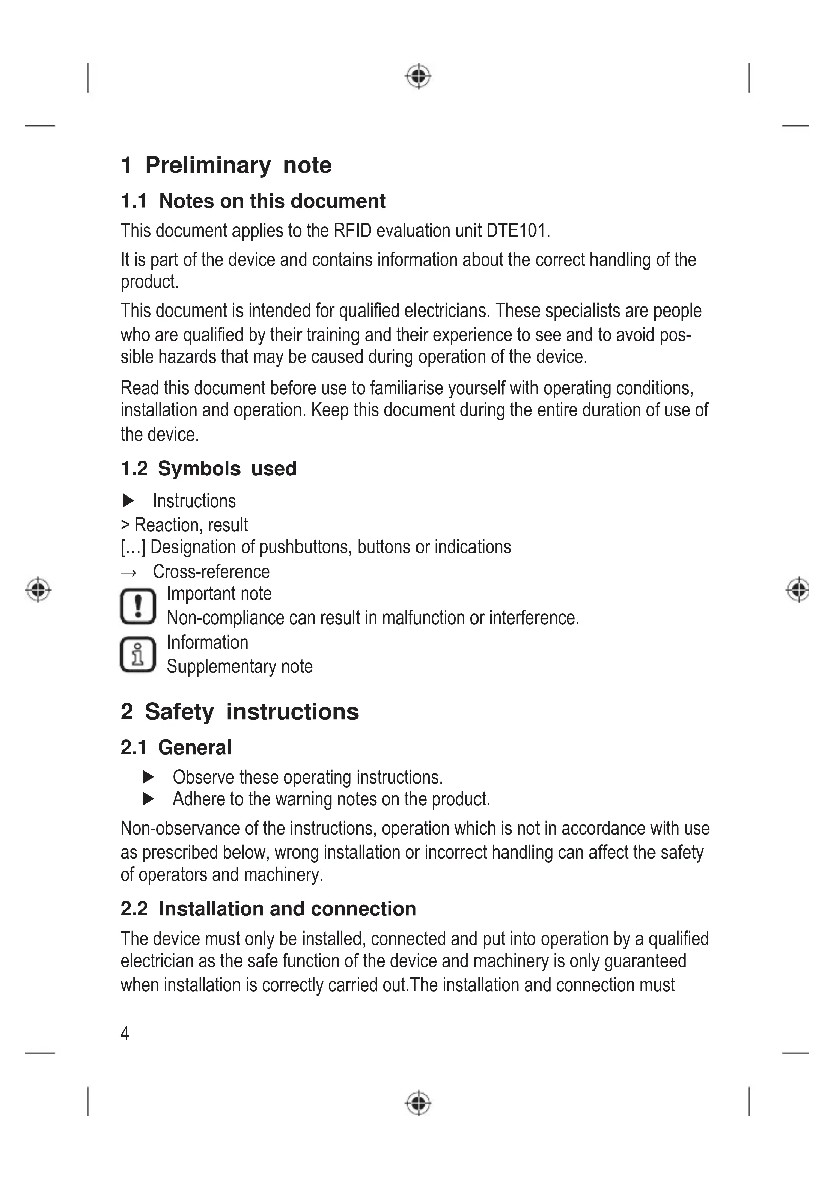 This document applies to the RFID evaluation unit DTE101. It is part of the device and contains information about the correct handling of the product. This document is intended for qualified electricians. These specialists are people who are qualified by their training and their experience to see and to avoid pos- sible hazards that may be caused during operation of the device. Read this document before use to familiarise yourself with operating conditions, installation and operation. Keep this document during the entire duration of use of the device.