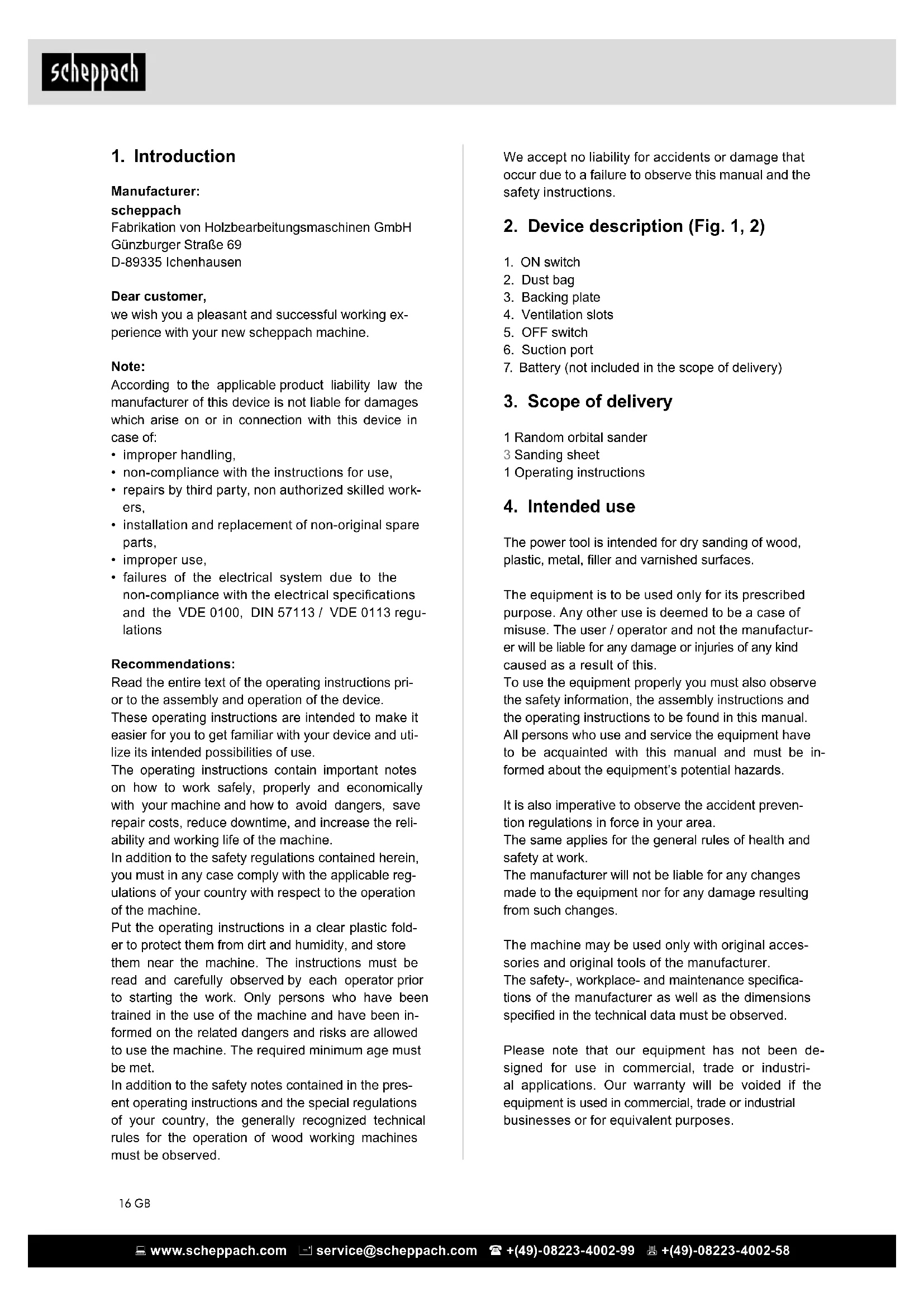 13. Troubleshooting .................................................................................... 21 www.scheppach.com service@scheppach.com +(49)-08223-4002-99 +(49)-08223-4002-58 16 GB We accept no liability for accidents or damage that occur due to a failure to observe this manual and the safety instructions.