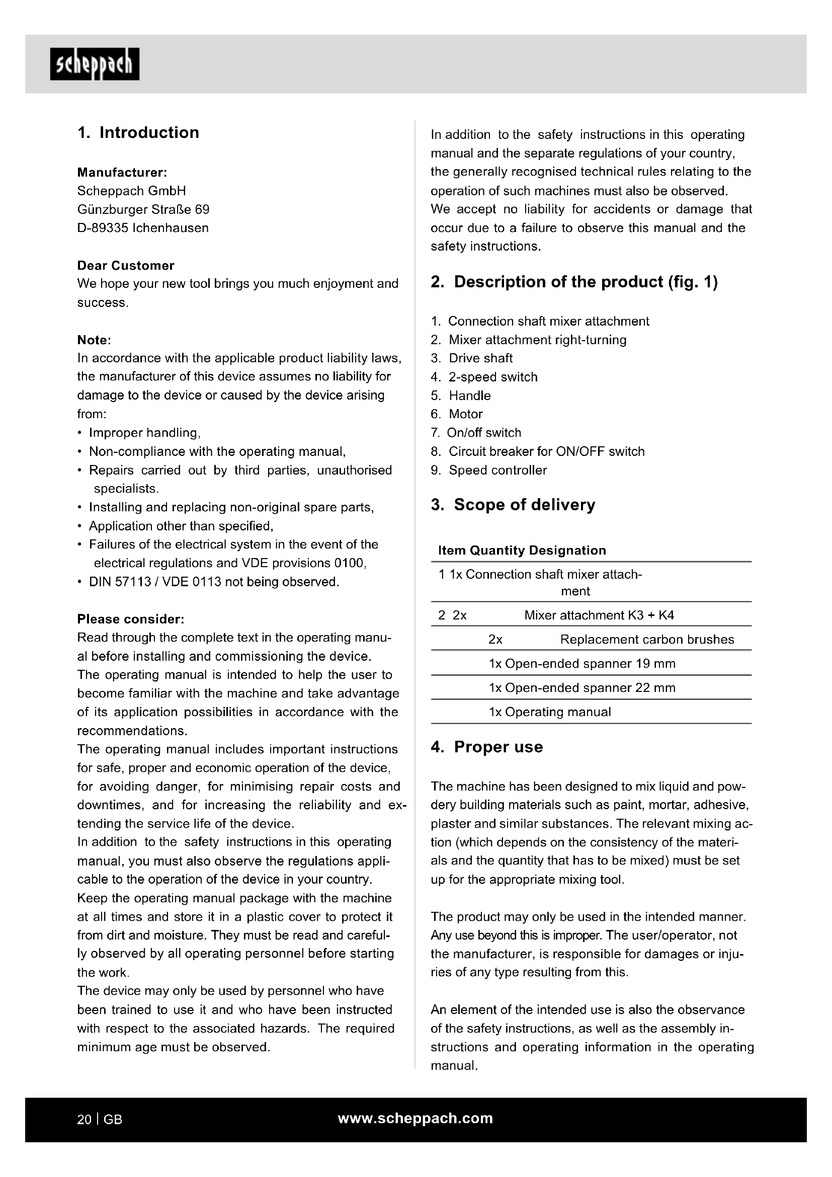 The machine has been designed to mix liquid and pow- dery building materials such as paint, mortar, adhesive, plaster and similar substances. The relevant mixing ac- tion (which depends on the consistency of the materi- als and the quantity that has to be mixed) must be set up for the appropriate mixing tool. The product may only be used in the intended manner. Any use beyond this is improper. The user/operator, not the manufacturer, is responsible for damages or inju- ries of any type resulting from this. An element of the intended use is also the observance of the safety instructions, as well as the assembly in- structions and operating information in the operating manual.www.scheppach.com