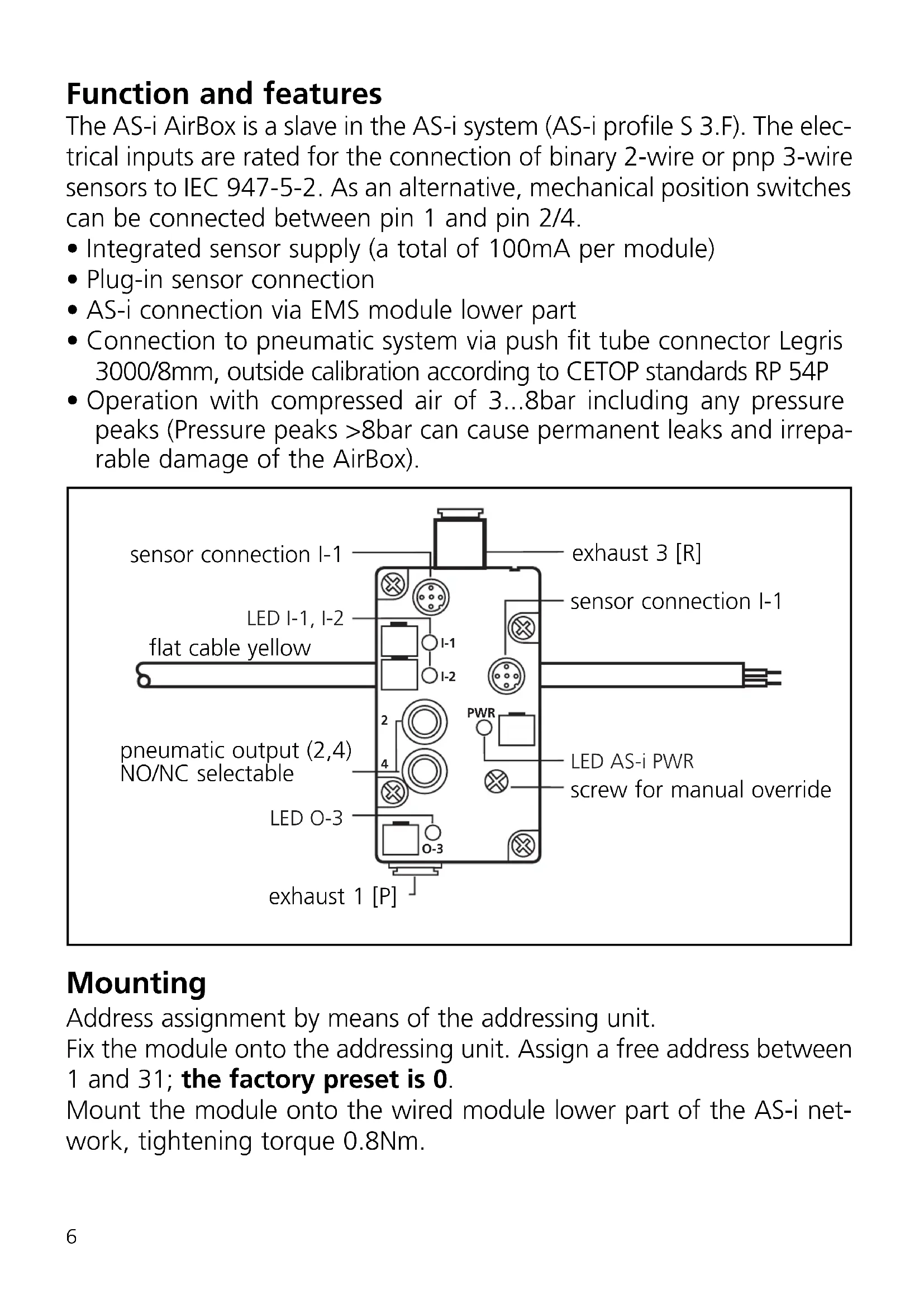 - Operation with compressed air of 3...8bar including any pressure peaks (Pressure peaks >8bar can cause permanent leaks and irrepa- rable damage of the AirBox). Mounting Address assignment by means of the addressing unit. Fix the module onto the addressing unit. Assign a free address between 1 and 31; the factory preset is 0. Mount the module onto the wired module lower part of the AS-i net- work, tightening torque 0.8Nm.