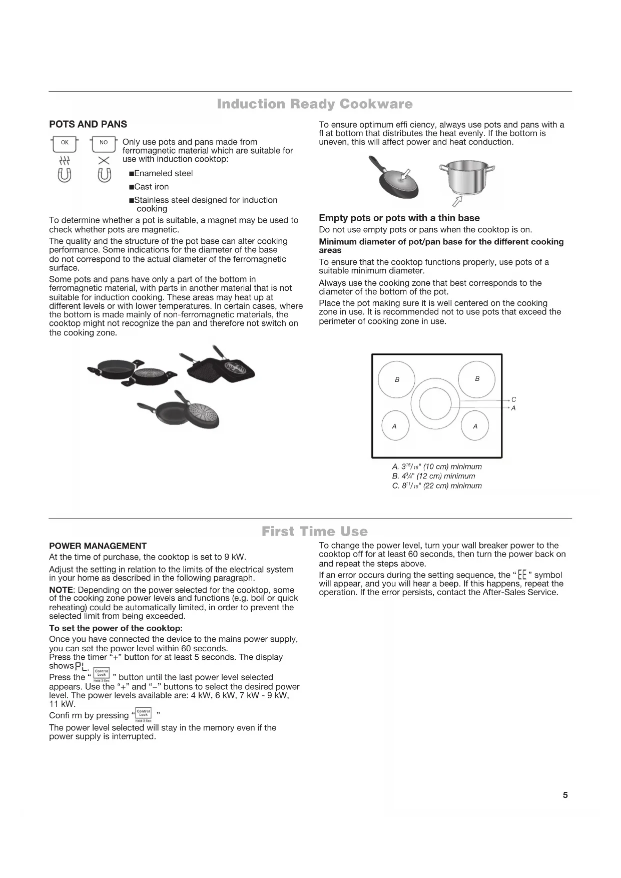 Control Panels 30" (78.2 cm) Touch-Activated Electronic Control Models5 First Time Use POWER MANAGEMENT At the time of purchase, the cooktop is set to 9 kW. Adjust the setting in relation to the limits of the electrical system in your home as described in the following paragraph. NOTE: Depending on the power selected for the cooktop, some of the cooking zone power levels and functions (e.g. boil or quick reheating) could be automatically limited, in order to prevent the selected limit from being exceeded. To set the power of the cooktop: Once you have connected the device to the mains power supply, you can set the power level within 60 seconds. Press the timer “+” button for at least 5 seconds. The display shows Press the “ ” button until the last power level selected appears. Use the “+” and “−” buttons to select the desired power level. The power levels available are: 4 kW, 6 kW, 7 kW - 9 kW, 11kW. Con rm by pressing “ ” The power level selected will stay in the memory even if the power supply is interrupted. To change the power level, turn your wall breaker power to the cooktop off for at least 60 seconds, then turn the power back on and repeat the steps above. If an error occurs during the setting sequence, the “ ” symbol will appear, and you will hear a beep. If this happens, repeat the operation. If the error persists, contact the After-Sales Service.