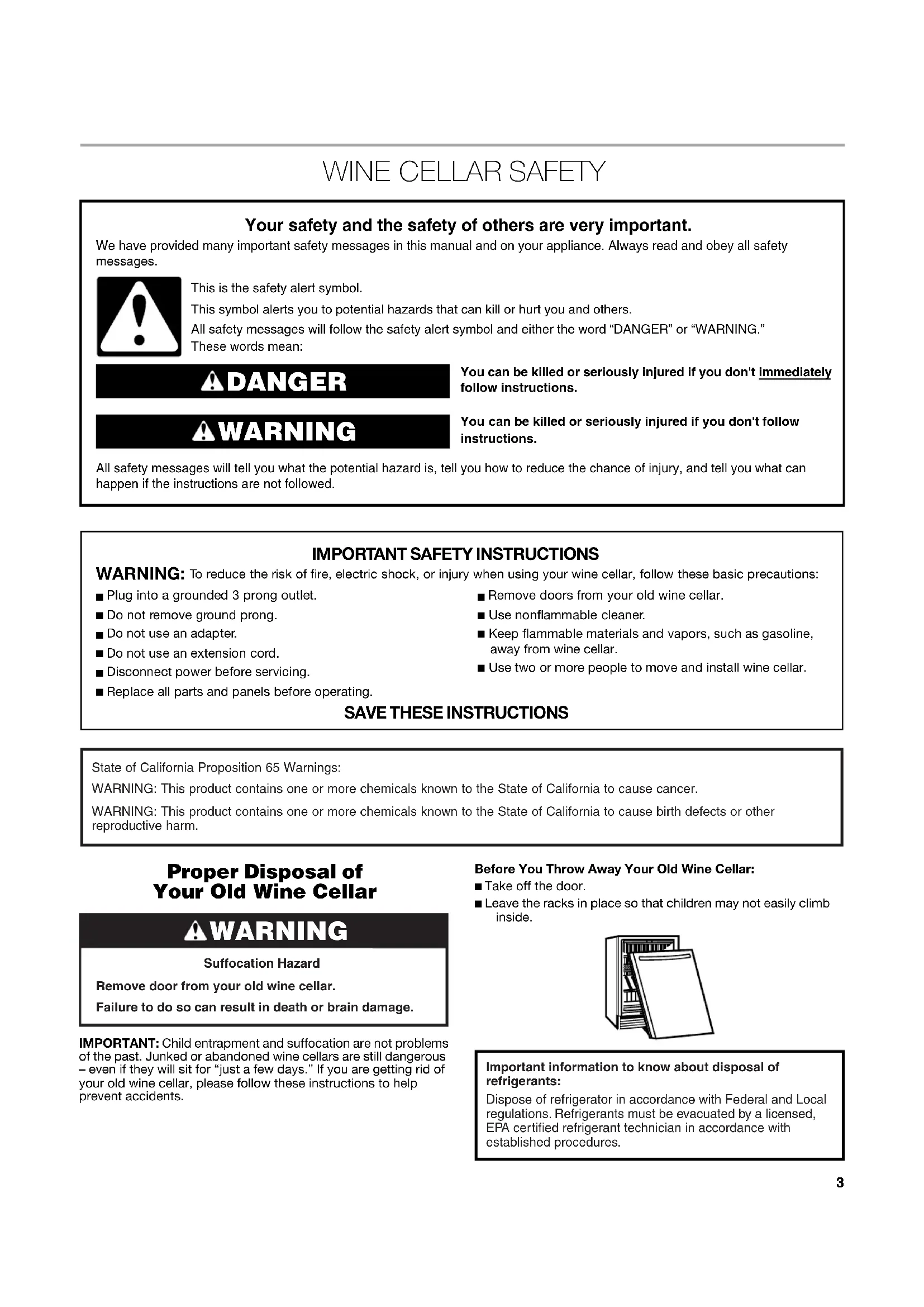 Proper Disposal of Your Old Wine Cellar IMPORTANT: Child entrapment and suffocation are not problems of the past. Junked or abandoned wine cellars are still dangerous – even if they will sit for “just a few days.” If you are getting rid of your old wine cellar, please follow these instructions to help prevent accidents.Before You Throw Away Your Old Wine Cellar:■ Take off the door.■ Leave the racks in place so that children may not easily climb inside. You can be killed or seriously injured if you don't immediately You can be killed or seriously injured if you don'tfollow All safety messages will tell you what the potential hazard is, tell you how to reduce the chance of injury, and tell you what can happen if the instructions are not followed. Your safety and the safety of others are very important. We have provided many important safety messages in this manual and on your appliance. Always read and obey all safety messages.This is the safety alert symbol.This symbol alerts you to potential hazards that can kill or hurt you and others.All safety messages will follow the safety alert symbol and either the word “DANGER” or “WARNING.”These words mean:follow instructions.instructions. DANGER WARNING