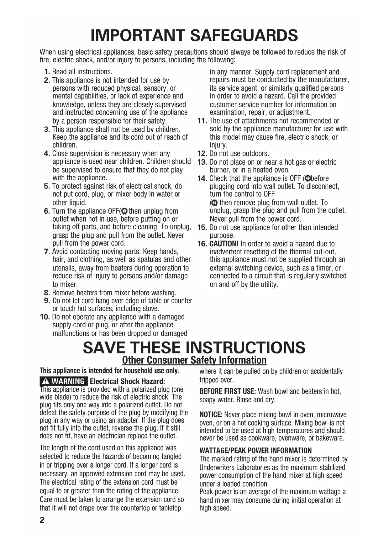 IMPORTANT SAFEGUARDS 1 Read all instructions. 2 This appliance is not intended for use by persons with reduced physical, sensory, or mental capabilities, or lack of experience and knowledge, unless they are closely supervised and instructed concerning use of the appliance by a person responsible for their safety. 3 This appliance shall not be used by children. Keep the appliance and its cord out of reach of children. 4 Close supervision is necessary when any appliance is used near children. Children should be supervised to ensure that they do not play with the appliance. 5 To protect against risk of electrical shock, do not put cord, plug, or mixer body in water or other liquid. 6 Turn the appliance OFF( ), then unplug from outlet when not in use, before putting on or taking off parts, and before cleaning. To unplug, grasp the plug and pull from the outlet. Never pull from the power cord. 7 Avoid contacting moving parts. Keep hands, hair, and clothing, as well as spatulas and other utensils, away from beaters during operation to reduce risk of injury to persons and/or damage to mixer. 8 Remove beaters from mixer before washing.